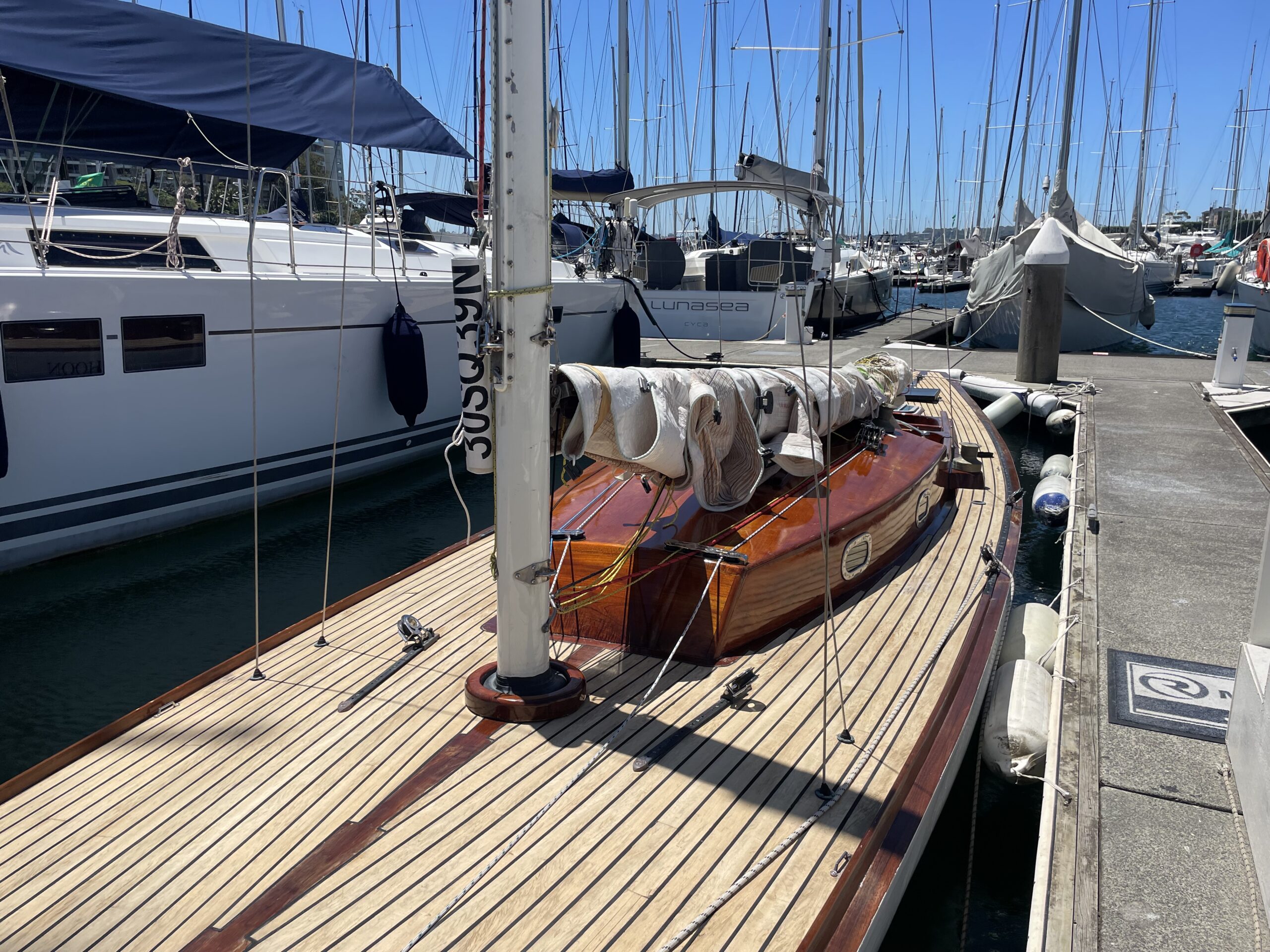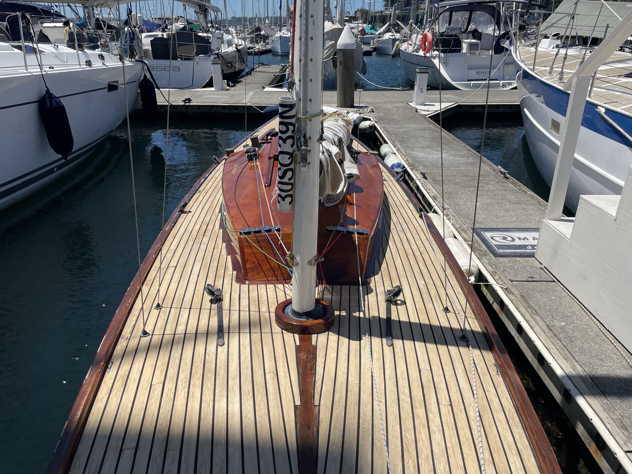 The “30 Square Metre” is a reference to a specific class. They are all very similar is shape. The result is a classic, fast-cruising, easily handled boat, known for their elegant lines and seaworthiness. The “Square Metre Rule” was adopted by the Royal Swedish YC in 1908. Typhoon is a very nice example, undergoing a substantial refit in June 2021 at Deagon Slipways in Brisbane and then sailed on her own bottom to Sydney. The inclusion of a diesel motor and replacement of the original fit out with settee bunks, make her a great harbour racer and weekend cruiser. An inspection of this classic yacht will not disappoint.
