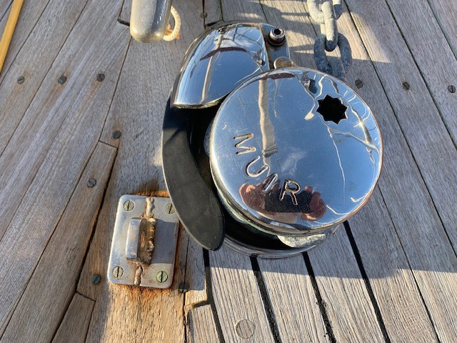 Muir VR2200 anchor winch with up/down switch and counter in cockpit. 35lb CQR anchor, 50m of chain, and 50m of rope warp. Second anchor, chain and warp.