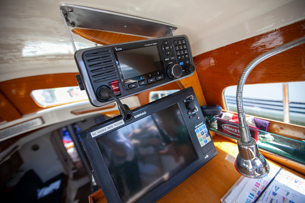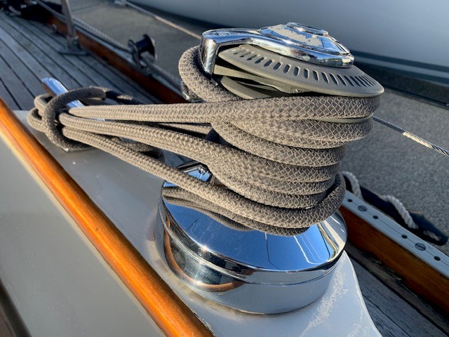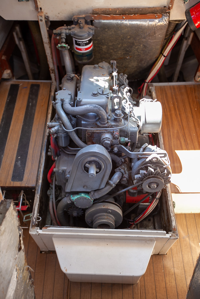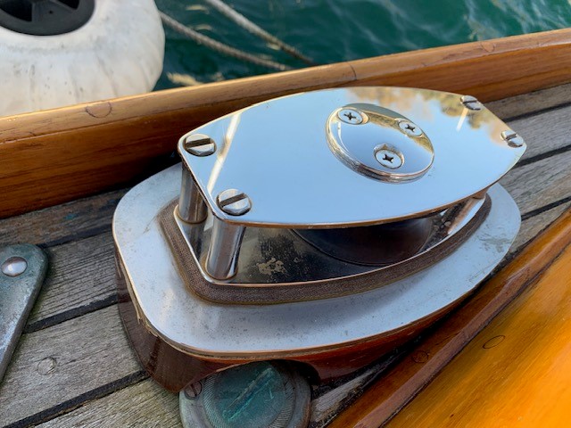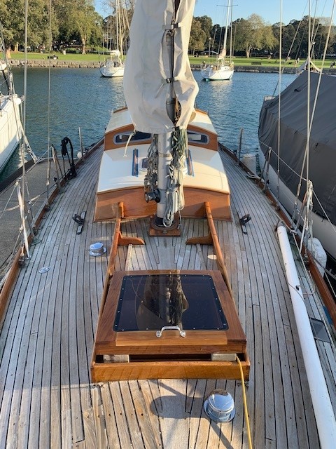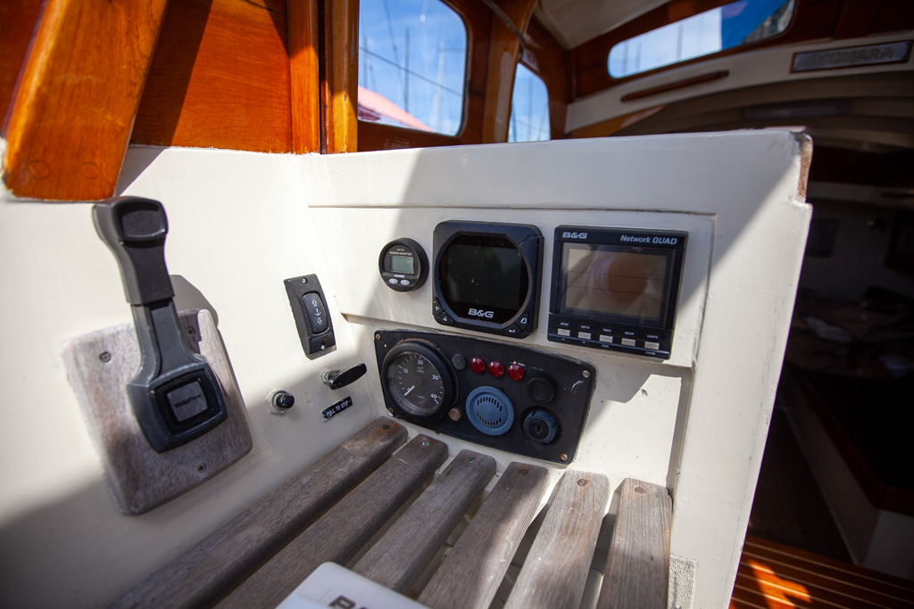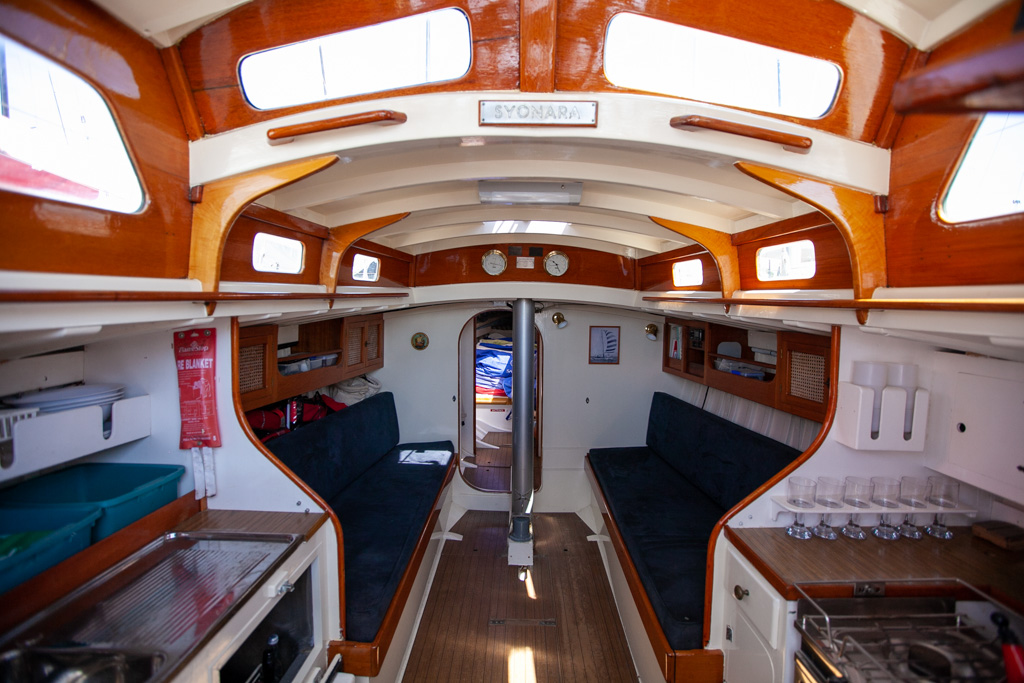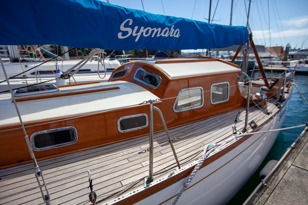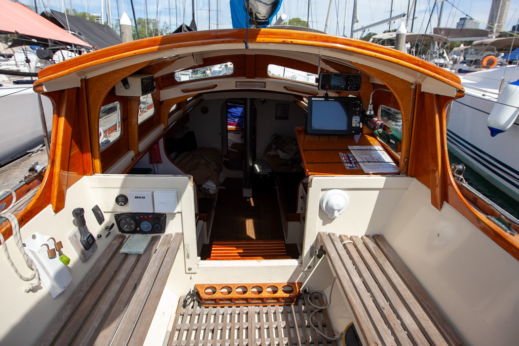 In 1982, ‘Syonara’ had a major refit including, a revised deck layout, changes to boom and sails, wheel steering was added, along with autopilot and instruments. A new engine had been installed in 1979, a Yanmar 3QM30. Teak on the rear deck was sanded and recorked this year. Just completed all exterior varnish in October 2024.
