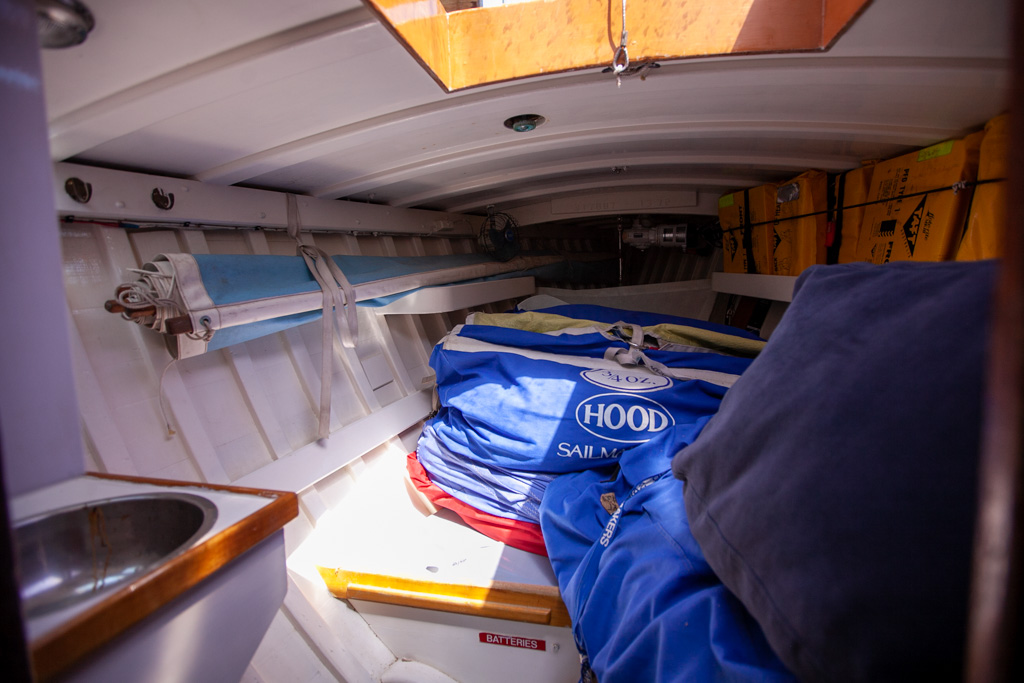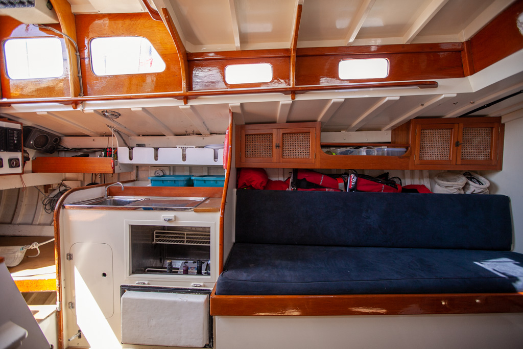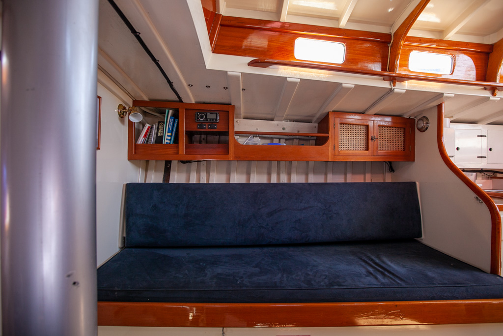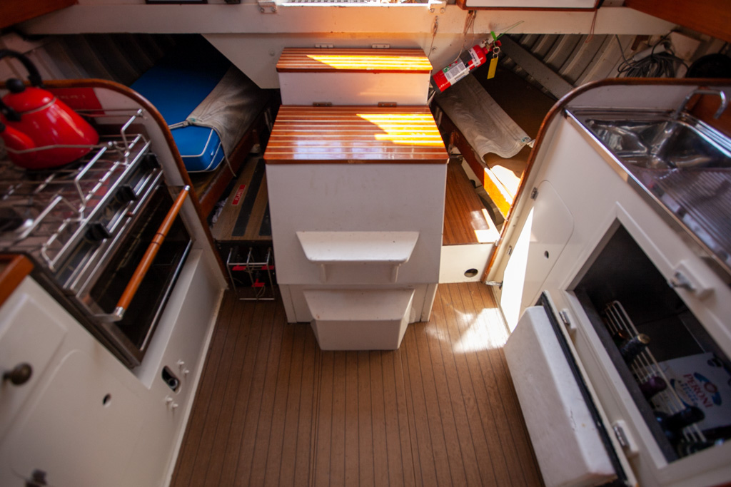 Large, uncluttered cockpit. Unique open design linking cockpit and saloon, (with strong backs for closure for ocean sailing). 4 x sea berths with lee cloths, one converts to double berth at anchor. Drop-leaf saloon table doubles as a cockpit table at anchor. Jabsco head and custom holding tank. Forward cabin used for sail storage. Large lazarette.