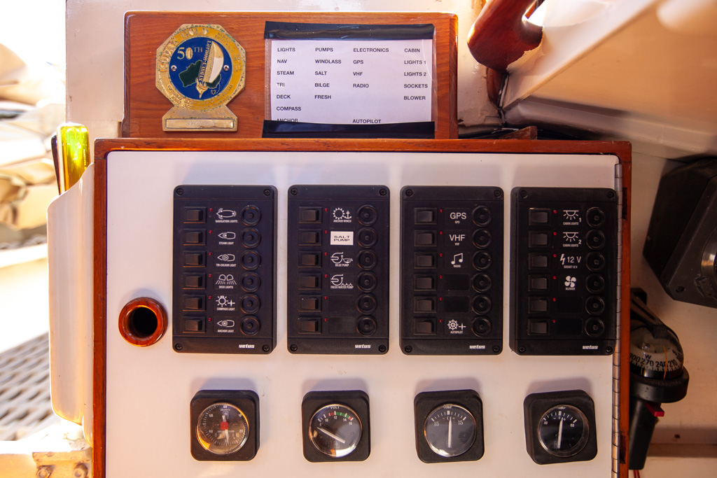 3 x 110-amp hour closed cell batteries, individually isolatable. 80-amp Bosch alternator. Vetus switchboard.