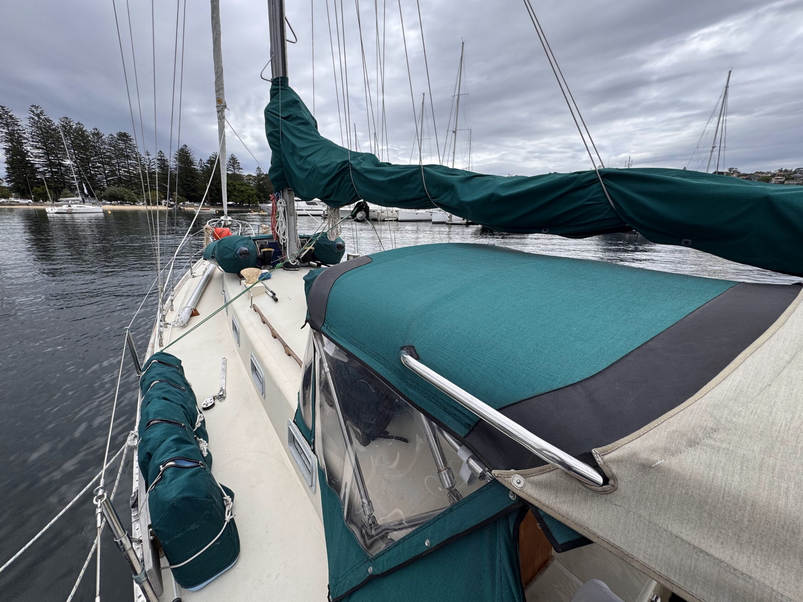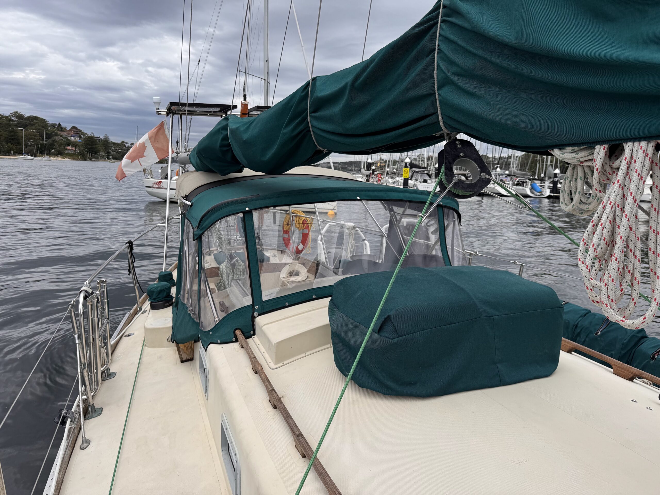 - Custom 316 Stainless Steel Solar Arch, Pushpit and Cockpit Rail added in 2024. Sunbrella dodger and dodger extension (new 60-gauge Strataglass windows put into dodger). Sunbrella covers for dinghy, liferaft, winches, tiller, windshield, BBQ (2022) *Full roll of matching Persian Green Tweed Sunbrella
