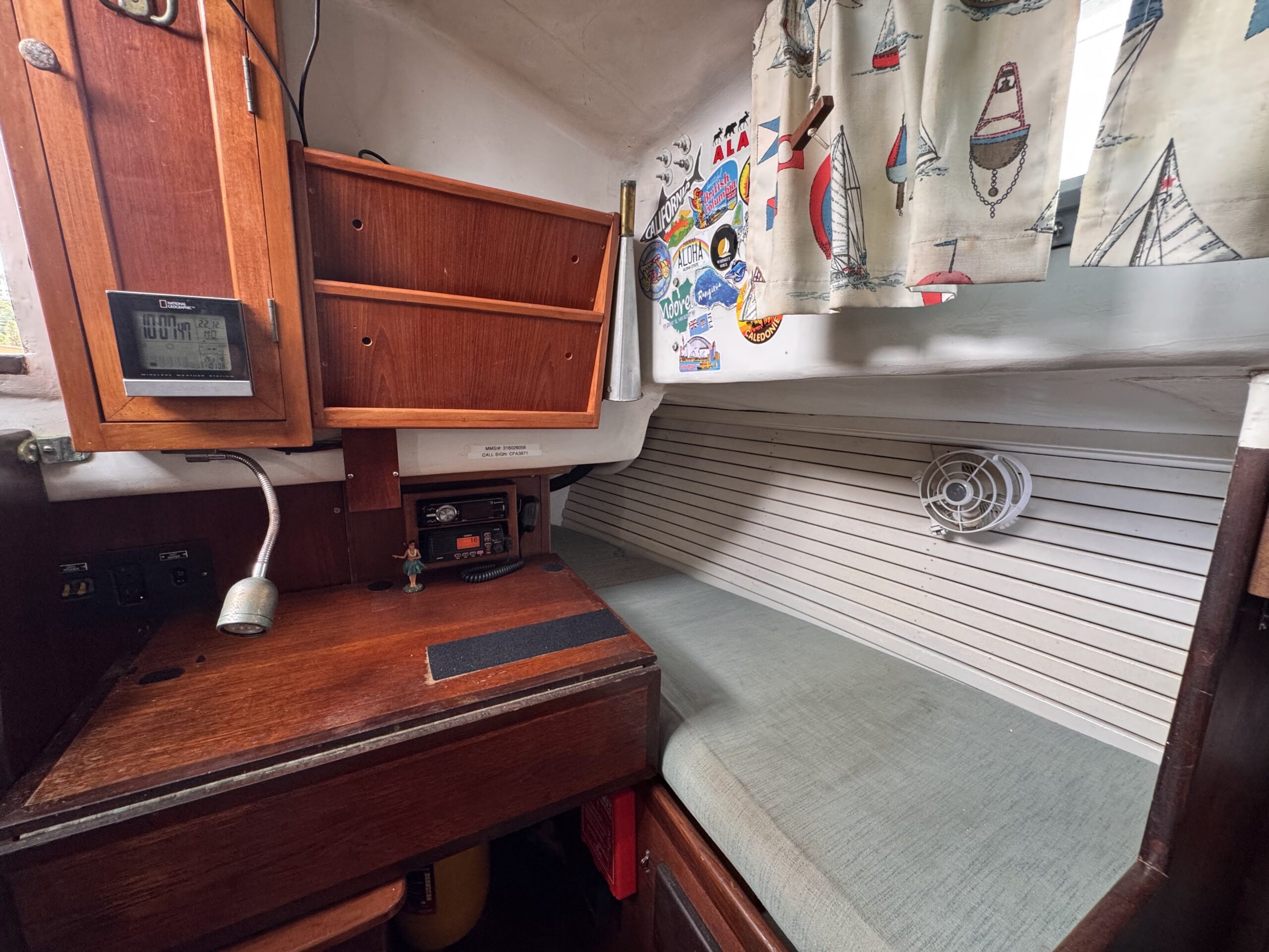 Aft there is a full-length quarter berth on each side and a Nav table with chart storage and a folding chair.
