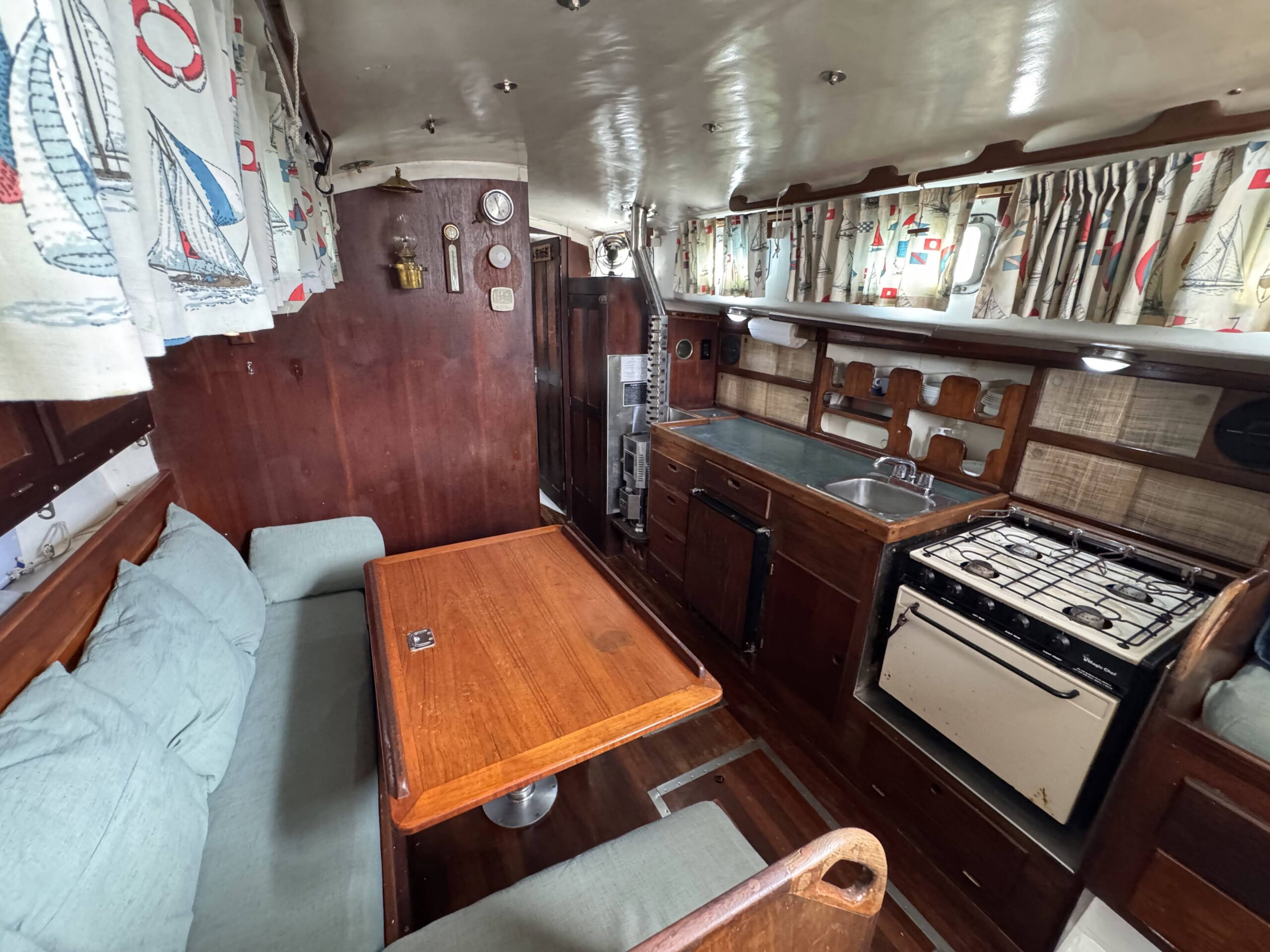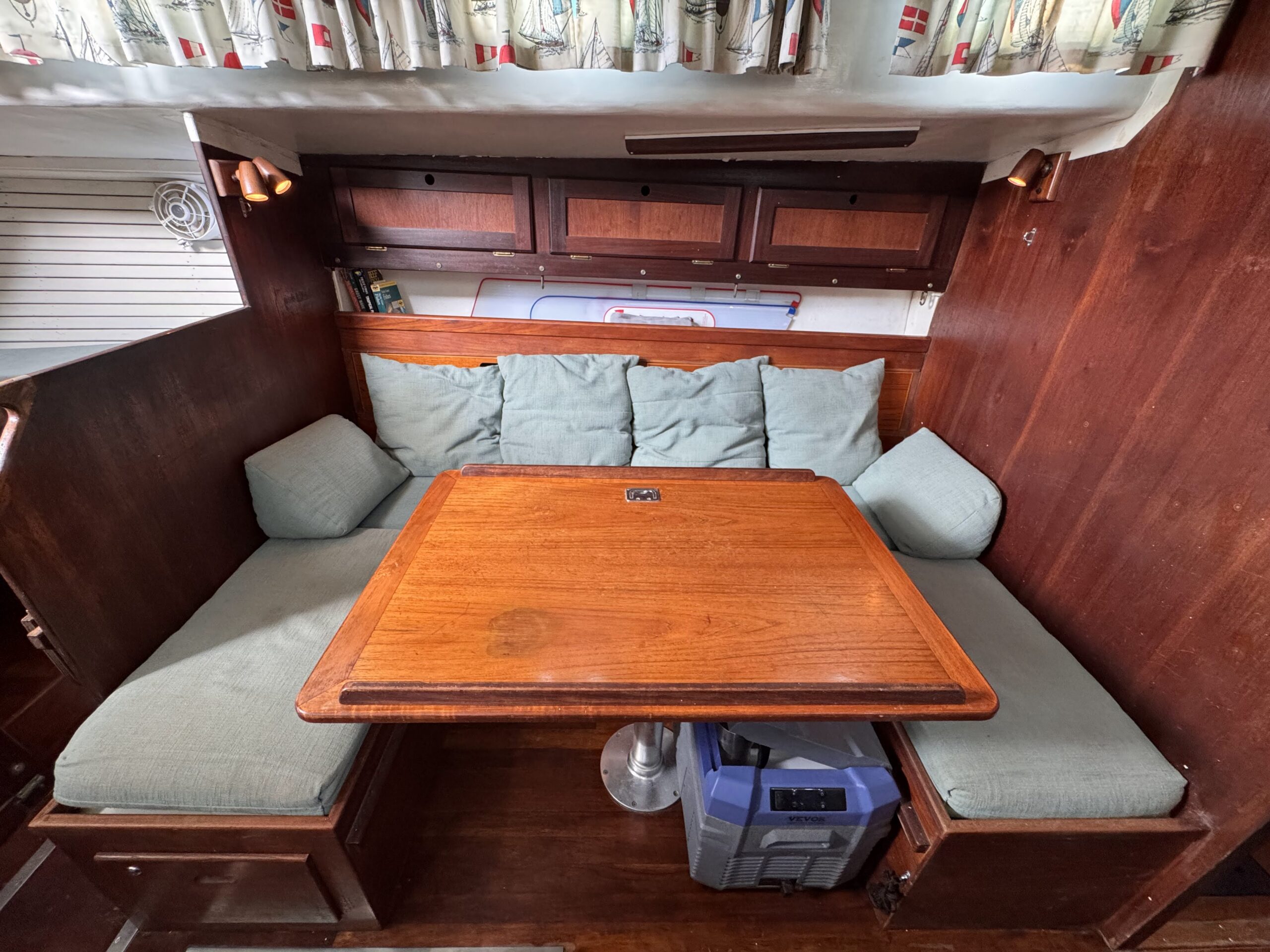 The saloon features, on it’s starboard side – a vented hanging locker and diesel furnace forwards and a full-length galley with sink, bar fridge/freezer and ample storage; on it’s port side – a C-shaped booth settee with a dining table that drops down to become a double bed.