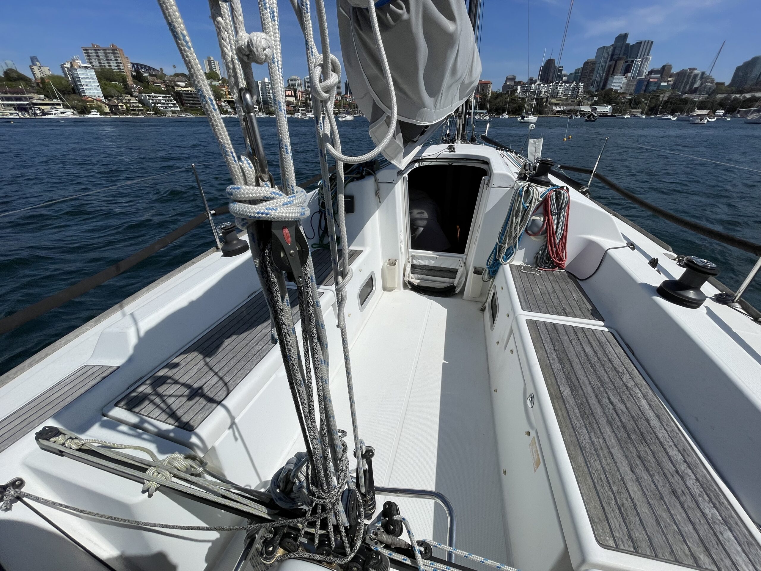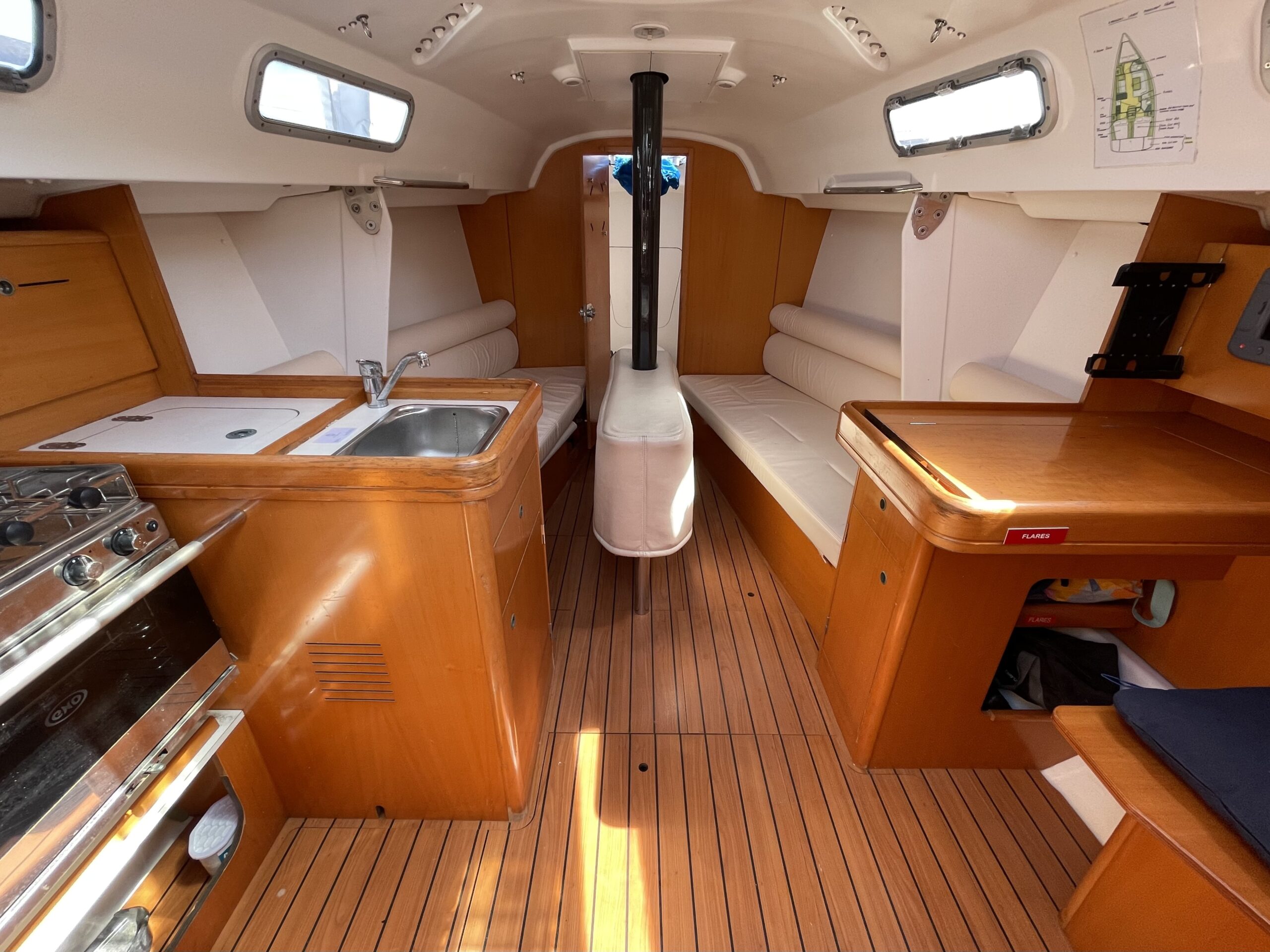 - Winches: 2 x Harken self-tailing 32.2 speed cabin top, 2 x Harken self-tailing 40.2 speed, spinlock jam cleats, blocks and deck gear, retractable Selden bowsprit, Spinnaker pole, Stainless Steel stauntions and wire with padding rewired in 2018. Plastimo compass.