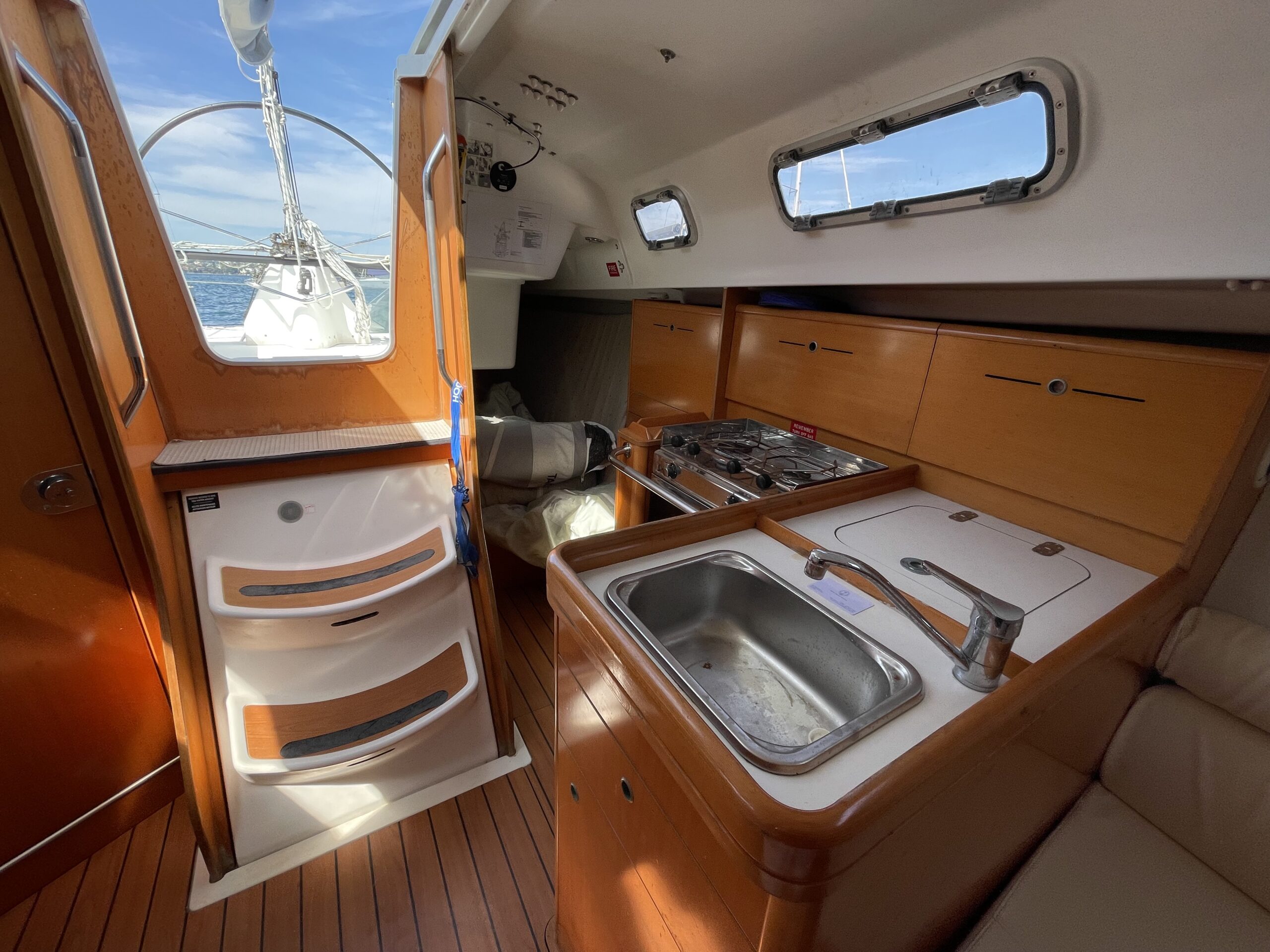 - ENO Open Sea range gas 2- burner stove, S/S sink with hot and cold fresh water and ample storage throughout.