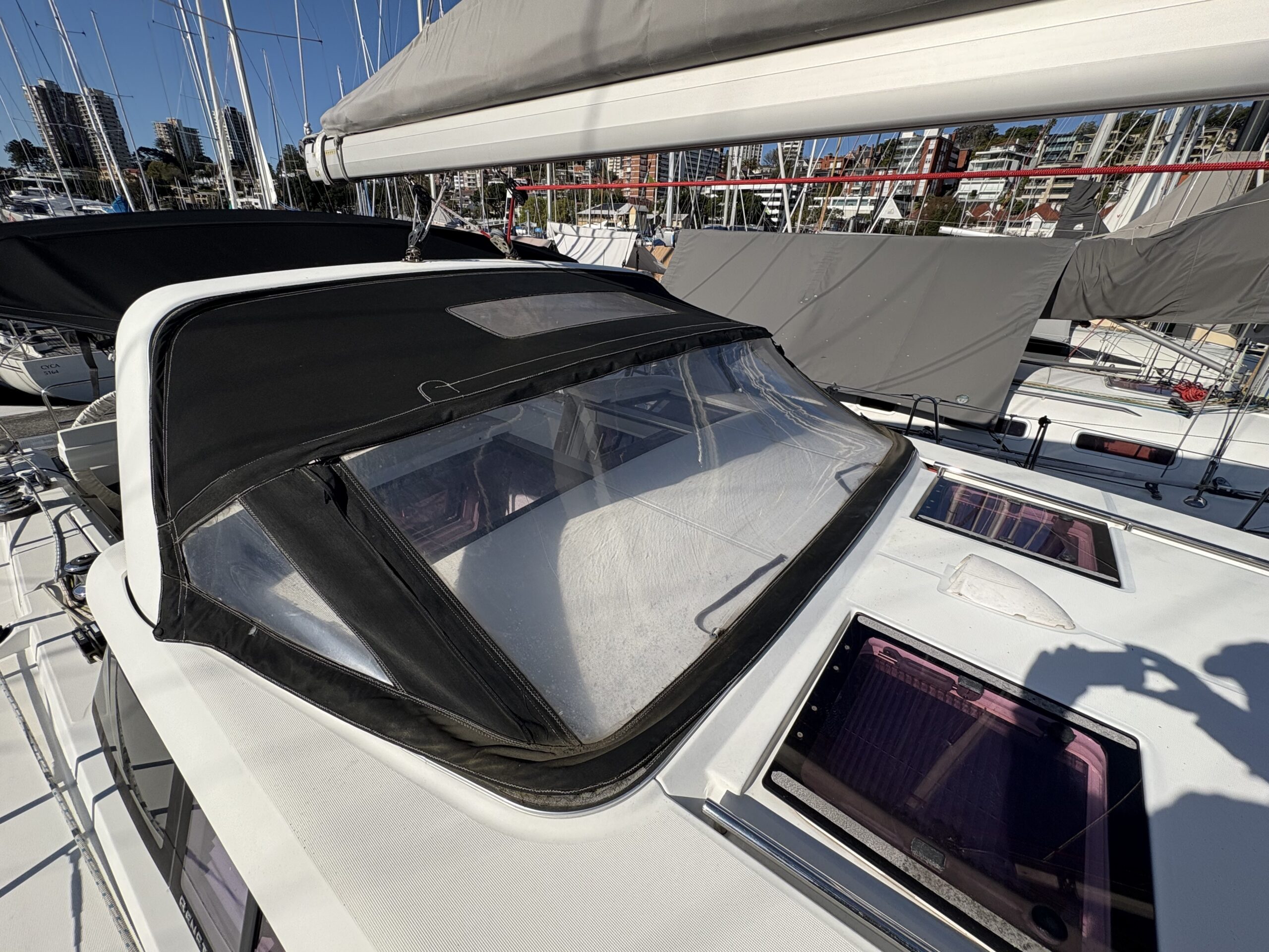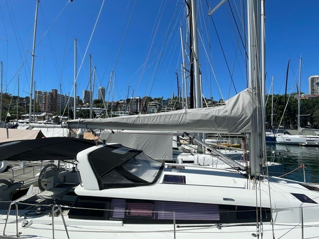 Boom cover, 1 x new Dodger cover connecting to a large Bimini that covers the entire aft deck, side curtains to enclose the cockpit area. Spare old Dodger in good condition, wheel covers, and high-quality cushions for all seating areas. Helm seat cushions in great condition with little use.