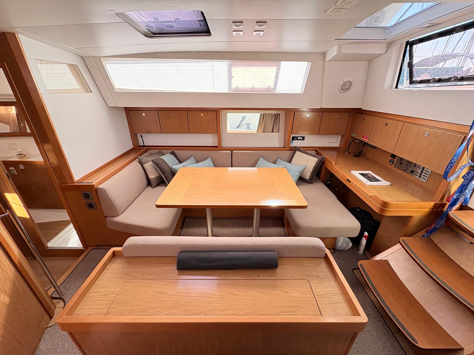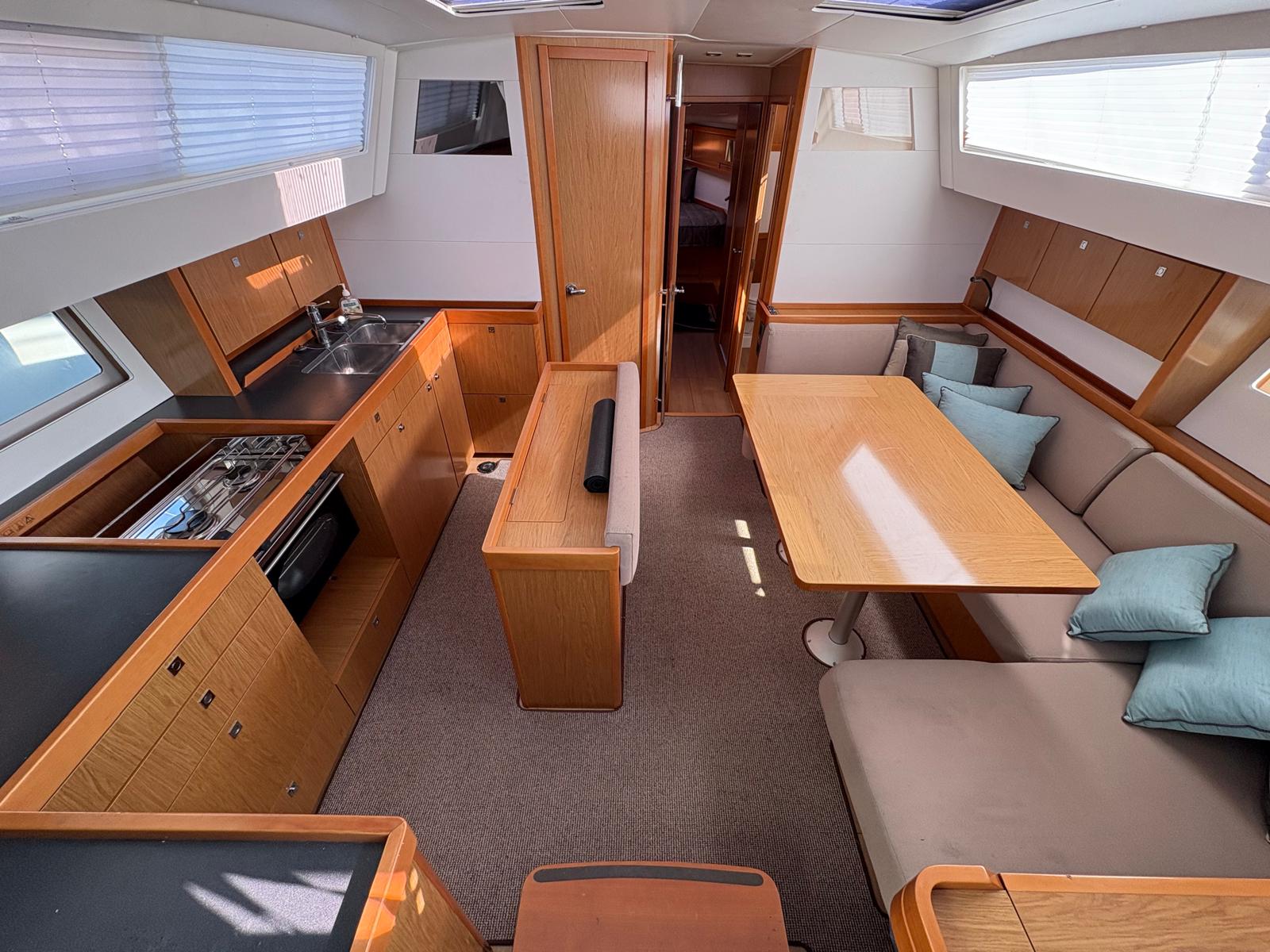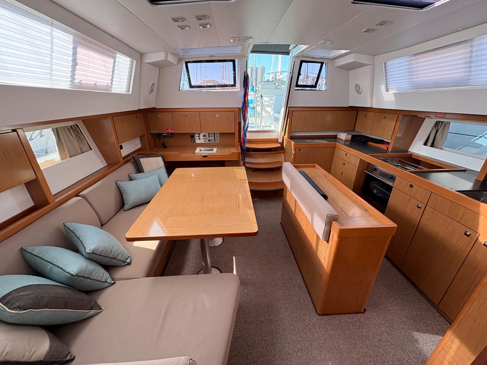 Main Saloon: Large open plan main saloon with loads of bench space and storage below, Large U shape living/dining area next to chart table with switchboard. There is a fold down bench seat off centre island to create seating right around the dining area.