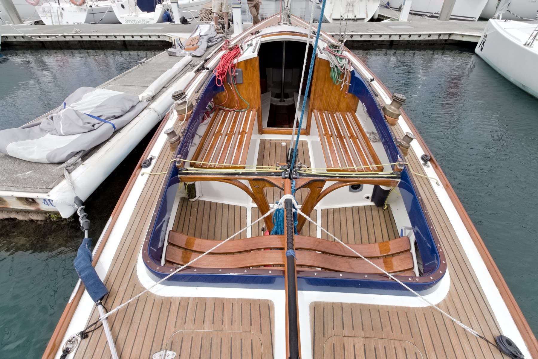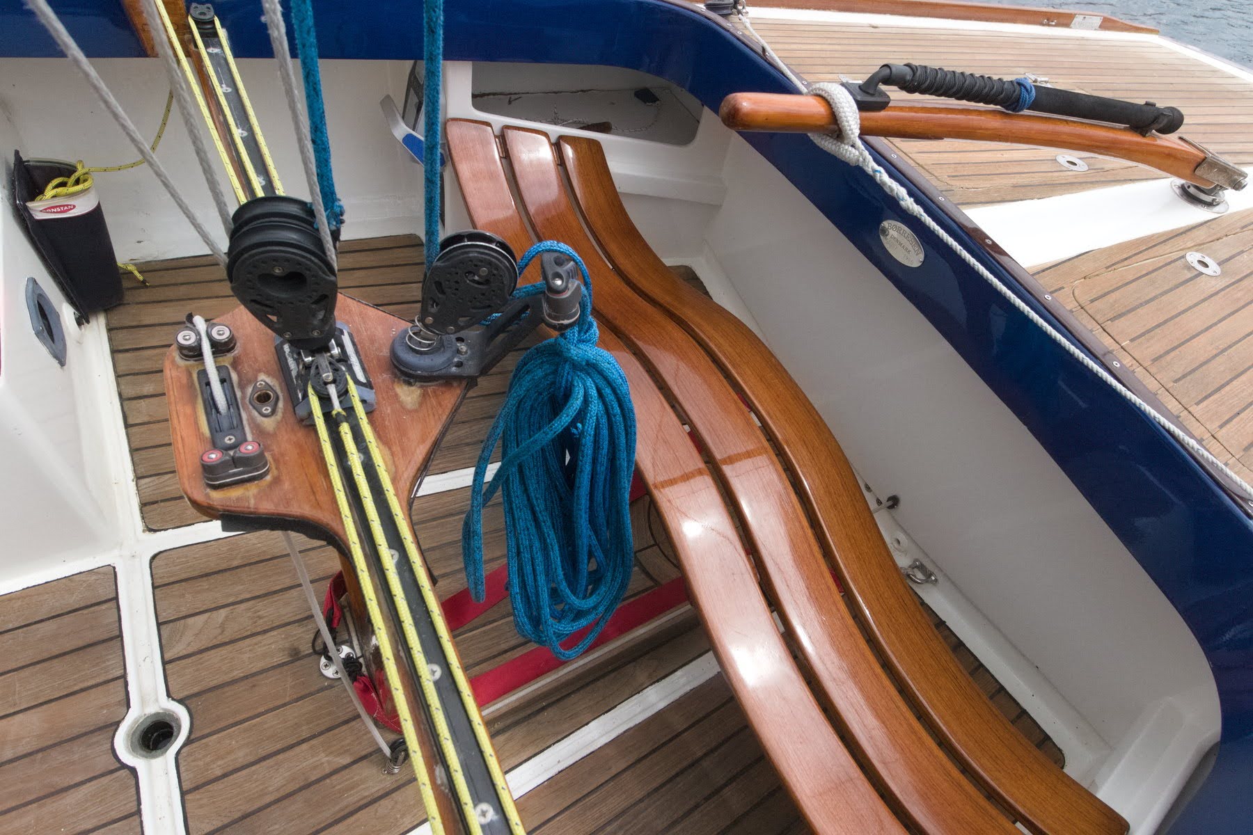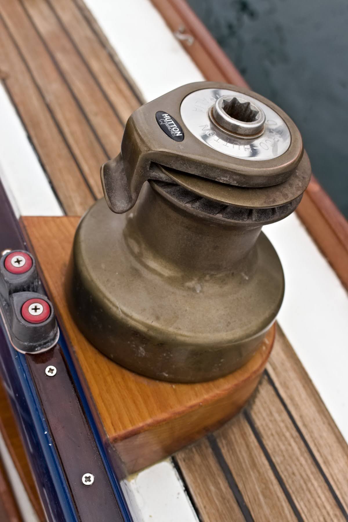 - 4 x Hutton 20 self tailing winches, 2 x Hutton 40 self tailing winches all with lock off cleats and are all bronze, All harken tracks + cleats, Wooden tiller, winch handles