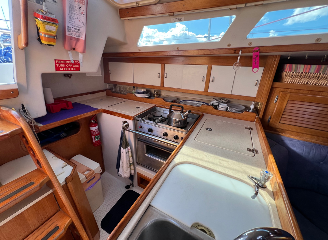 - Galley 2 sinks fresh and salt water supply. Hillerange two burner LP gas with oven, gimbled.