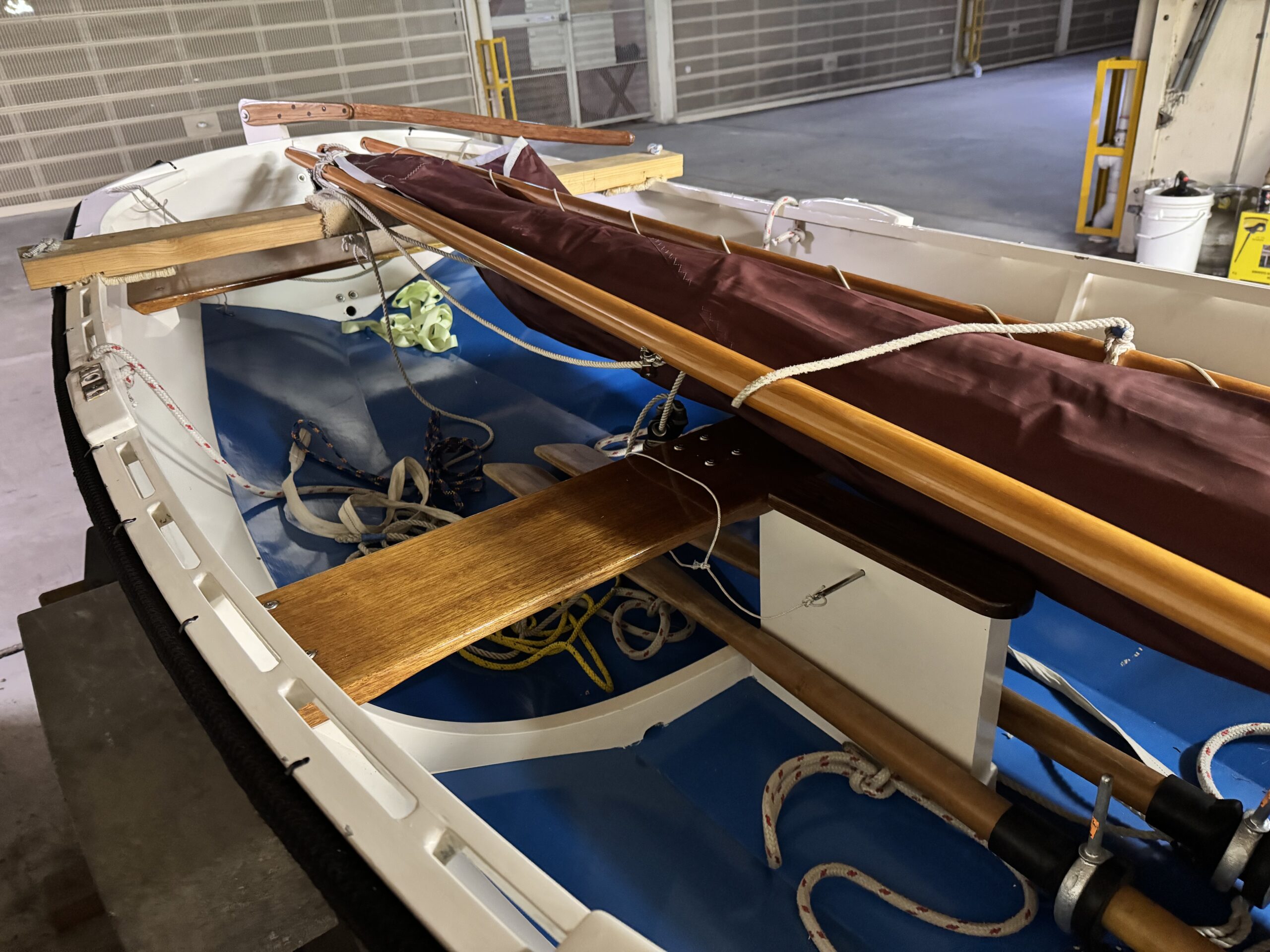 5 x fenders, 5 x various size moorling lines, 1 x towing line, crockery and cutlery.