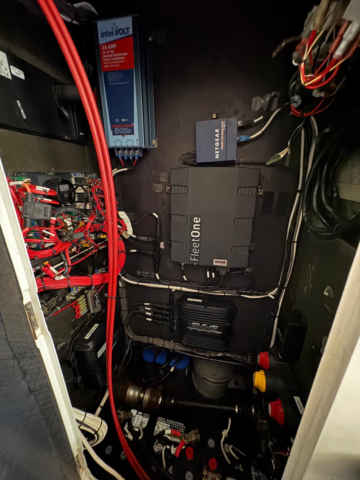 - MX420 navigation system, Simrad GPS, Satellite phone, ICOM VHF marine radio, Garmin wind instruments on deck.