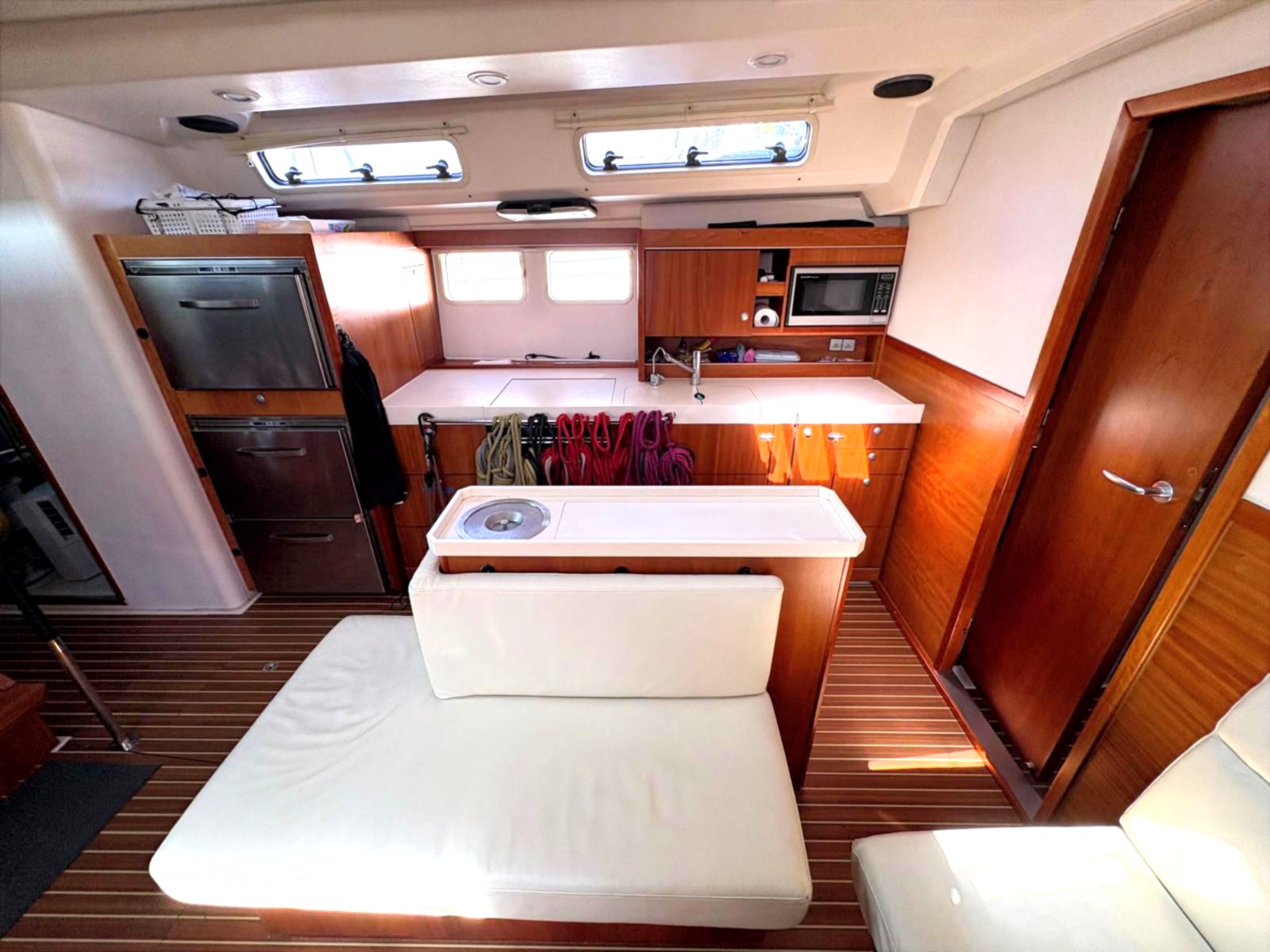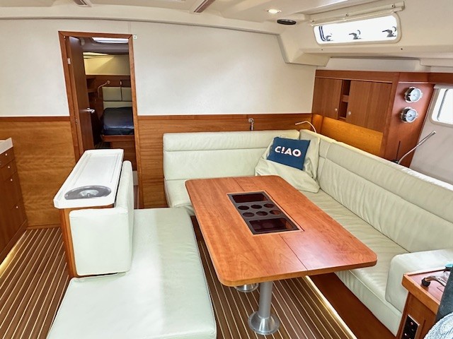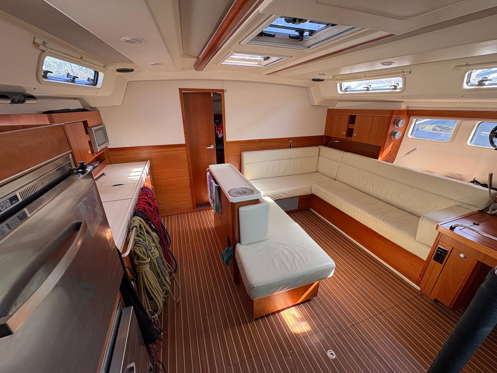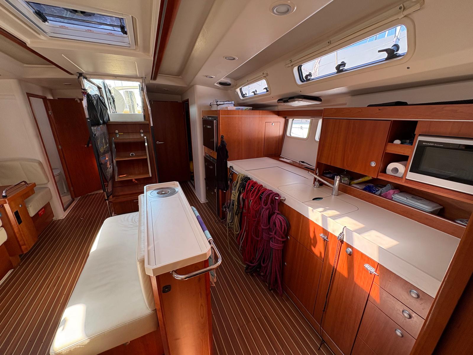 Saloon: Large table with folding leaves and an L-shaped sofa to starboard with Lee cloth. There is an Island unit with additional seating and bottle storage, extensive cupboard and drawer storage with LED reading lights.