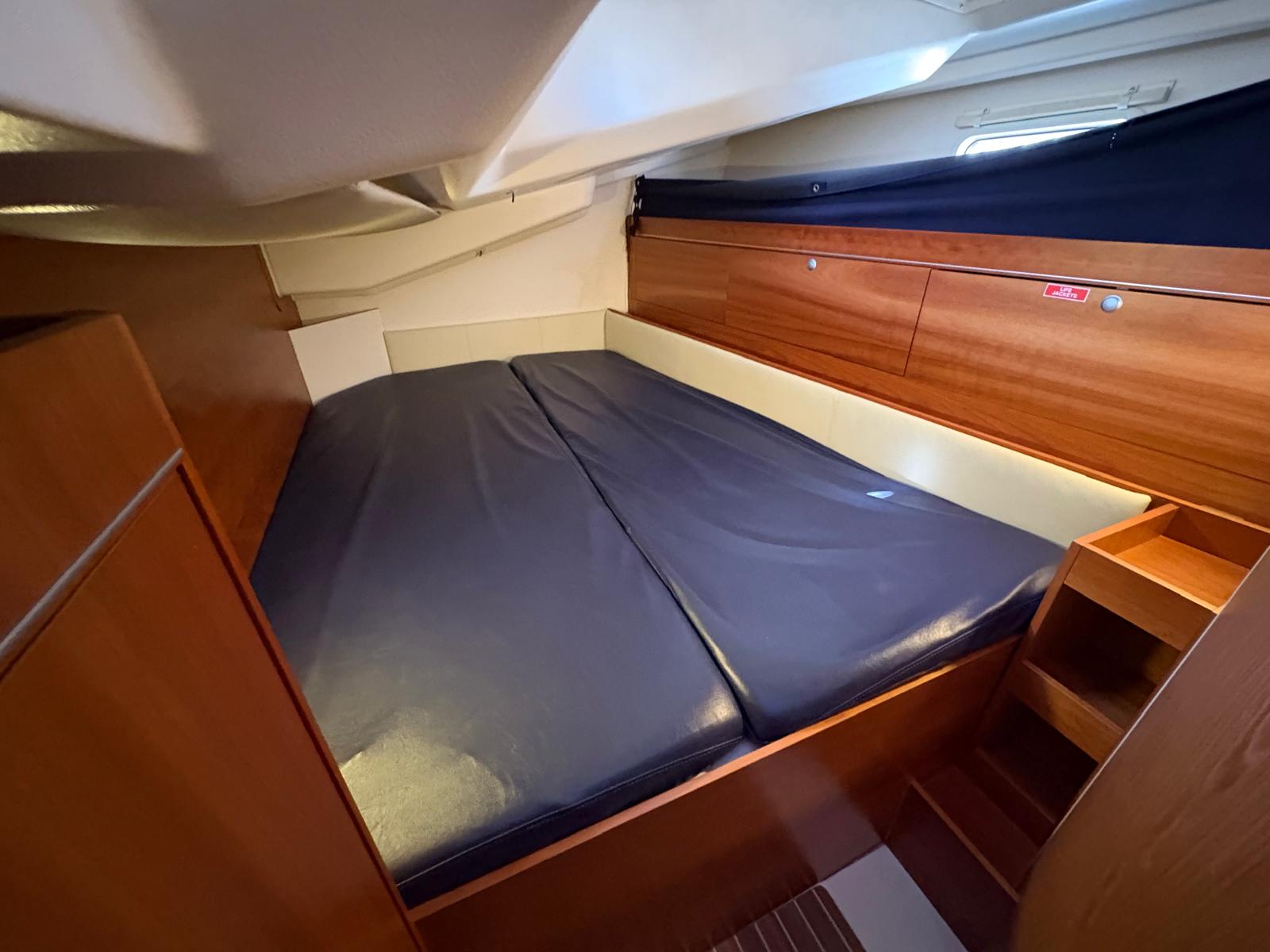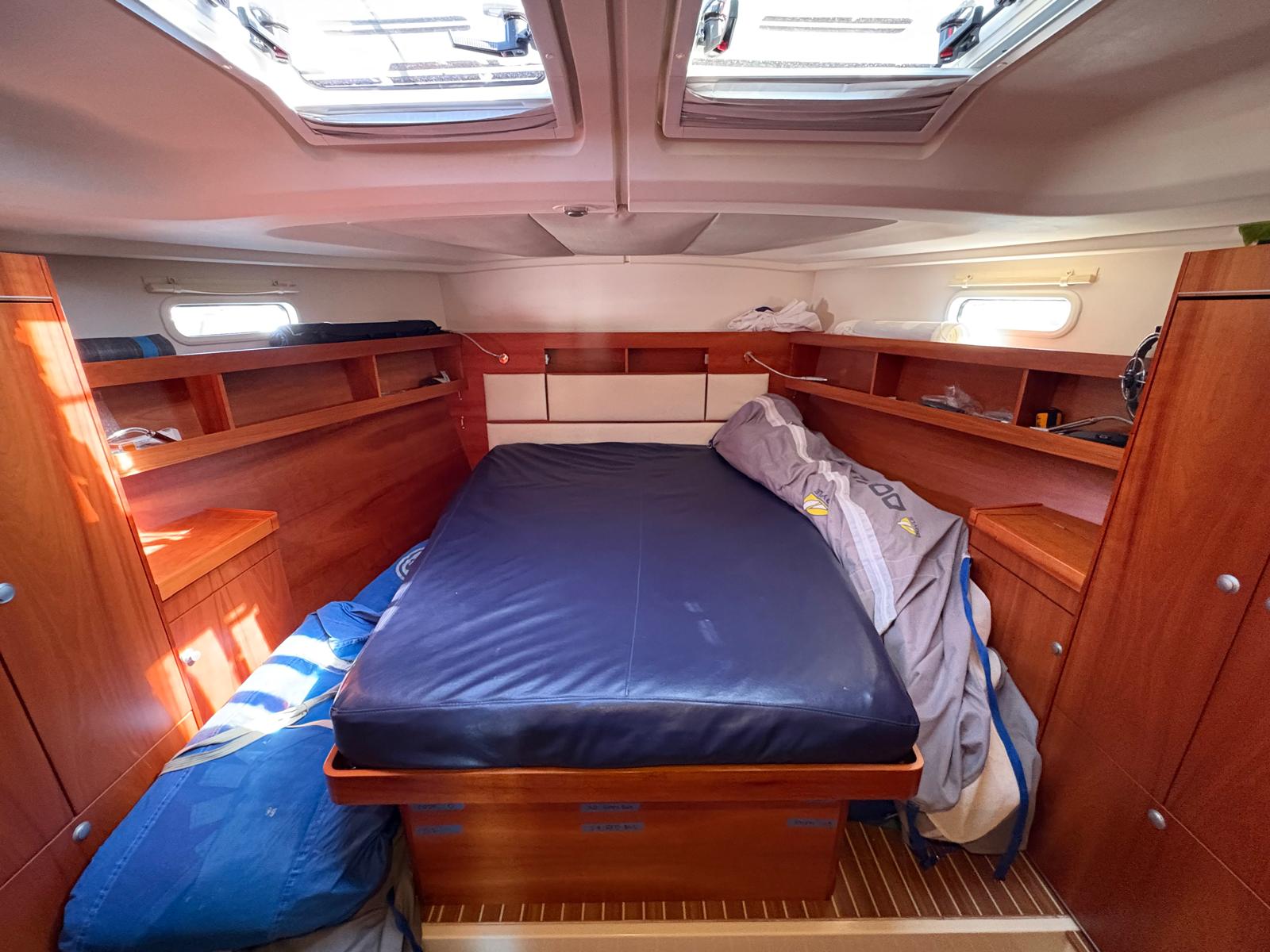 - Large island bed, twin hanging wardrobes with shoe stowage cupboards beneath, fans in cabins with USB sockets and LED reading lights. Freshwater electric toilet and wash basin in port side cubicle, along with a large dedicated hot and cold pressurised shower cubicle to starboard Currently used as a bosuns locker. Twin aft double cabins have large hanging wardrobes, stowage shelf, fans, USB sockets and LED reading lights. Aft of navigation table to starboard is the day head with a flush toilet and wash basin. Aft of galley port side is currently used as a large bosun's locker, alternatively this can be set up as a large day head and H/C shower.