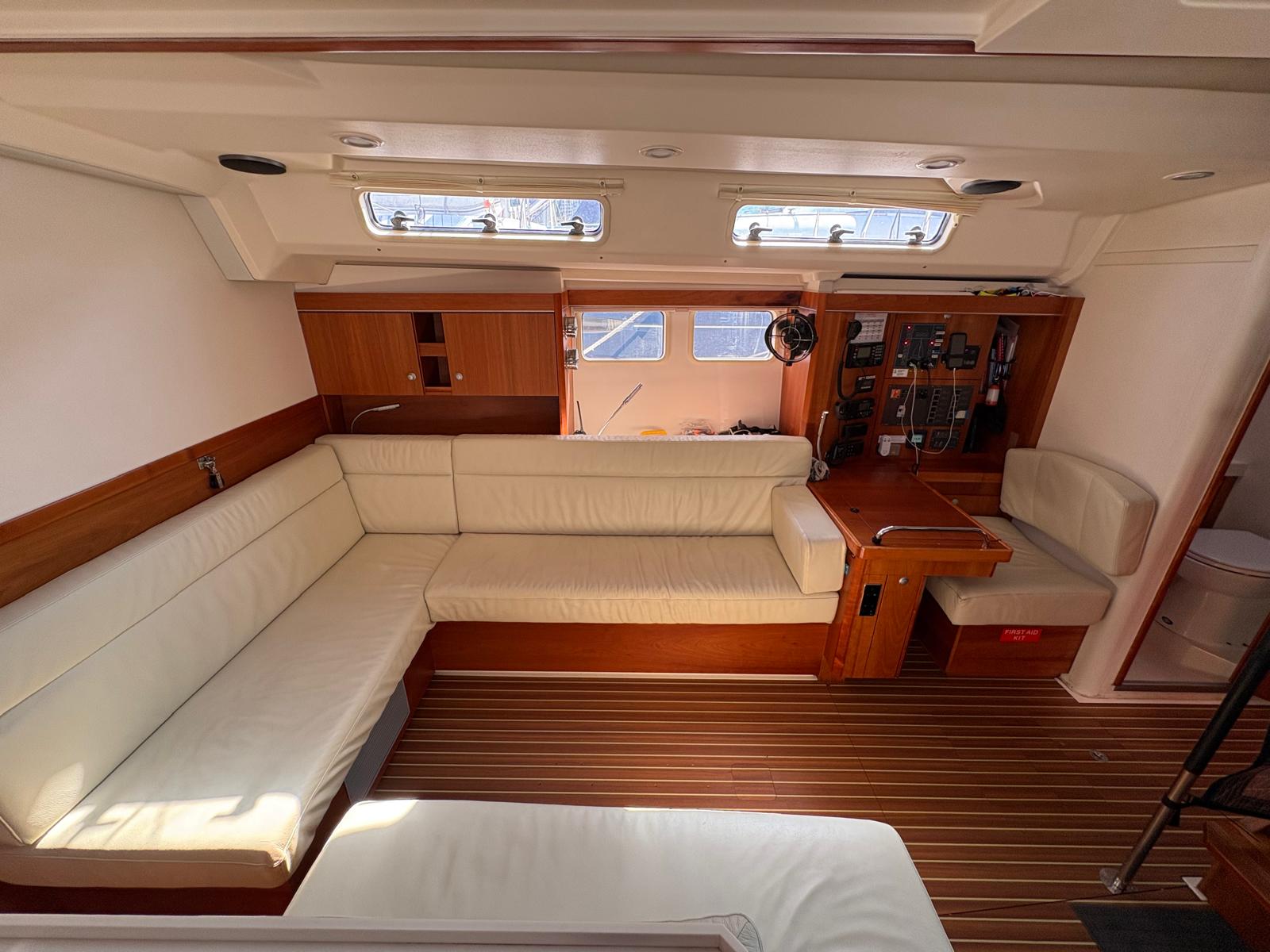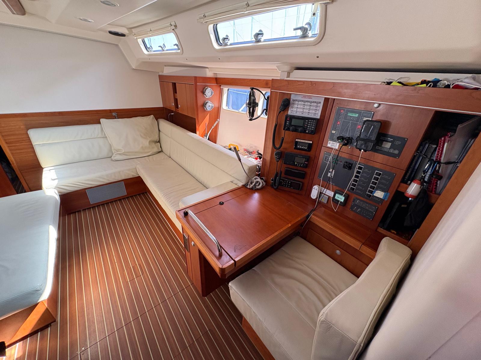 Navigation Station: To starboard aft of the saloon, with forward-facing chart table, sliding chart storage drawer, switching for 12V DC systems and switching for 240V AC systems. Battery, fuel, water monitoring panel and USB power socket.