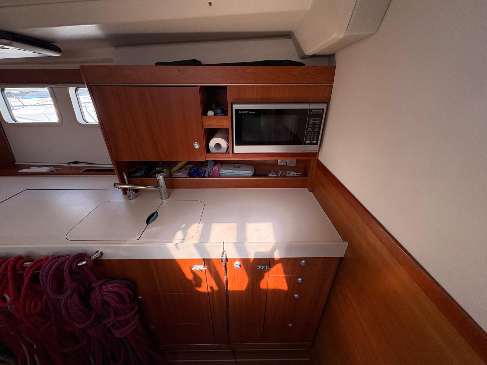 - Port side of main saloon area has 3-burner gas stove and oven, Sharp microwave, twin S/S Vitrifrigo drawer fridge, and single Vitrifrigo S/S drawer freezer. Ample storage cupboards and drawers. Nespresso coffee machine in secure draw.