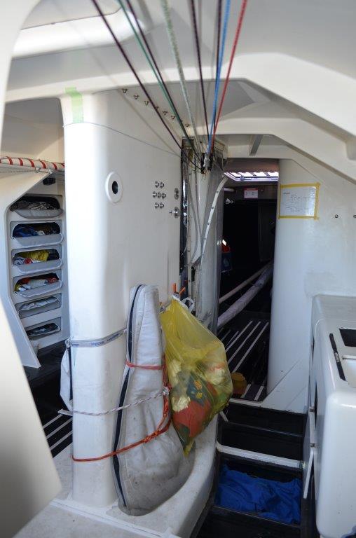 Opposite the galley on the port side is further storage lockers with fabric zip up fronts.
