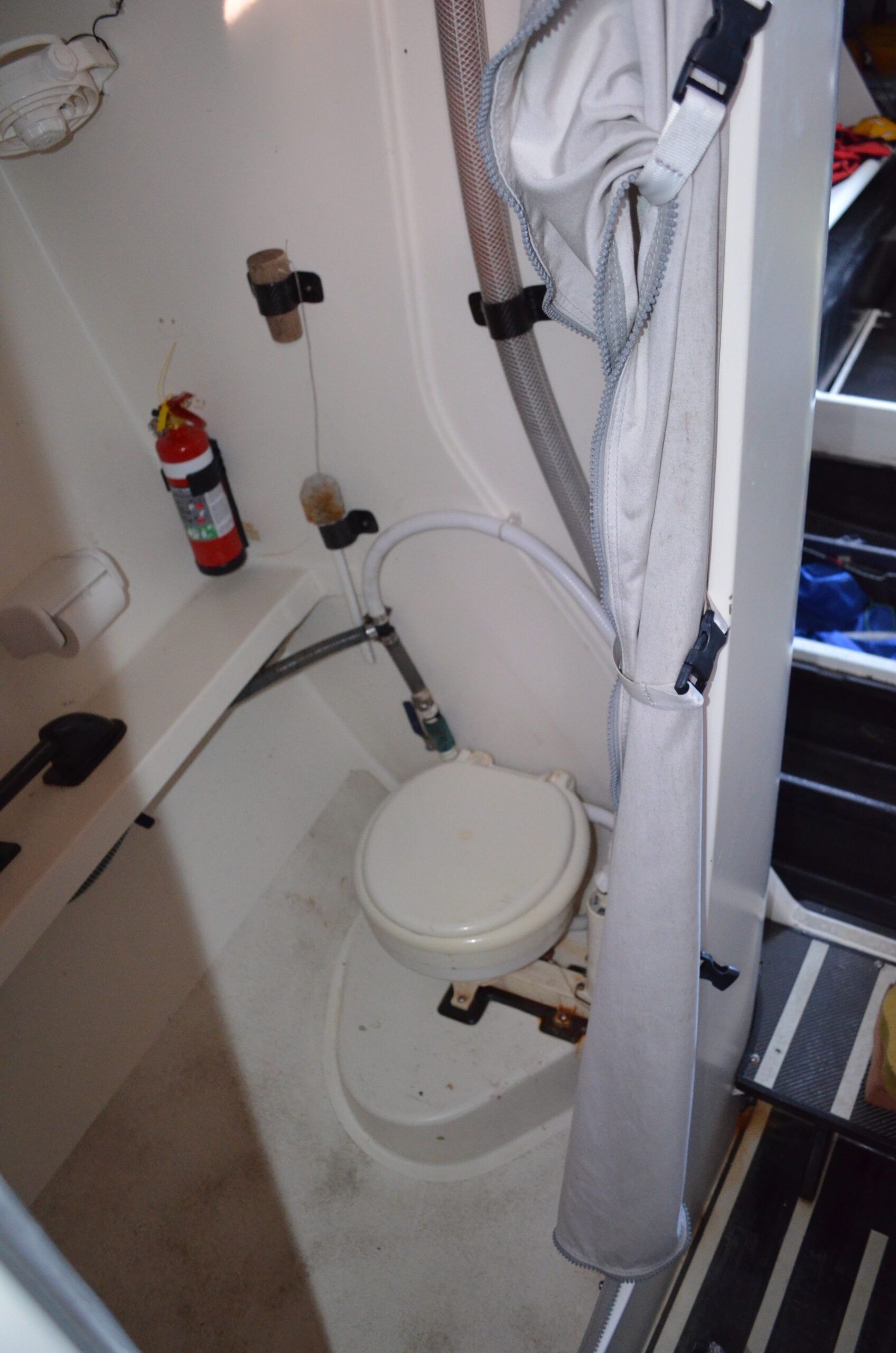 Forward of the mast bulkhead and to starboard is an enclosed head with manual flush toilet and handbasin. Opposite on the port side is a large hanging locker.