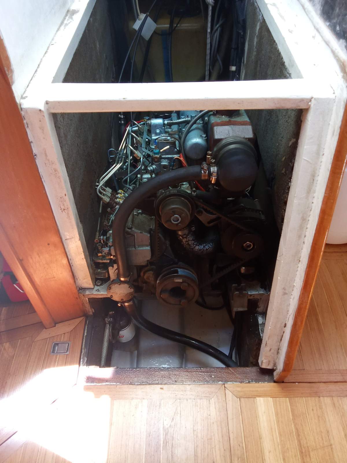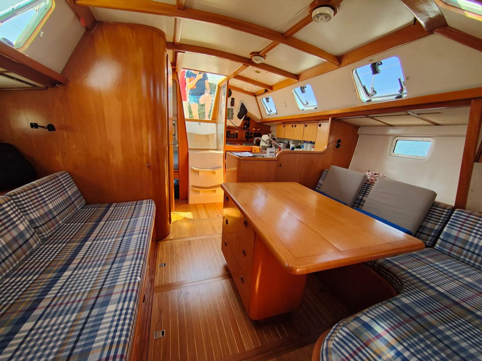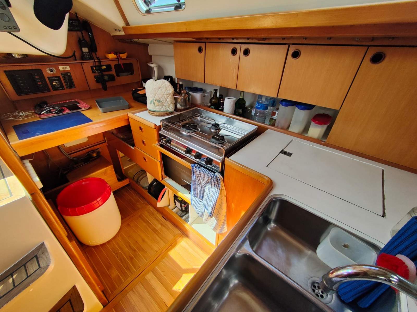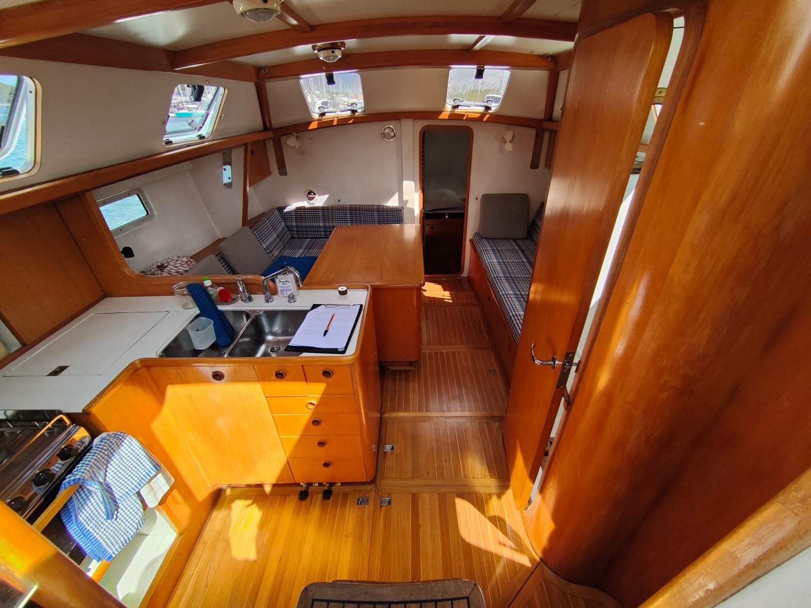 - U shape with ample bench and storage space. 3-burner gas stove and oven, double S/S sink with fresh and salt water pumps, under-bench tropicalized refrigerator 100 litres and navigation table aft. Lovely Teak and Holly timber flooring throughout. Access to the engine via the stairs to the upper deck.