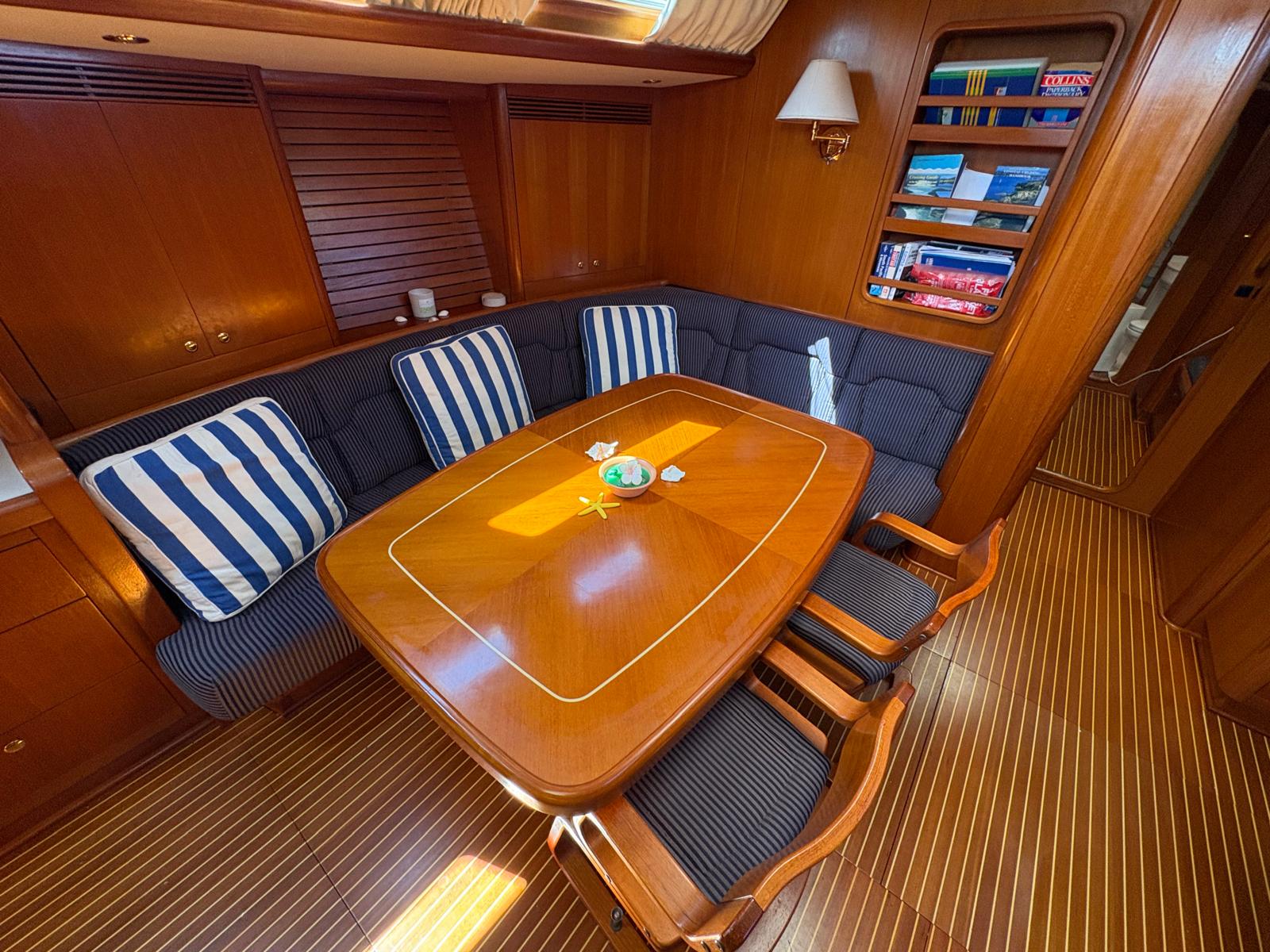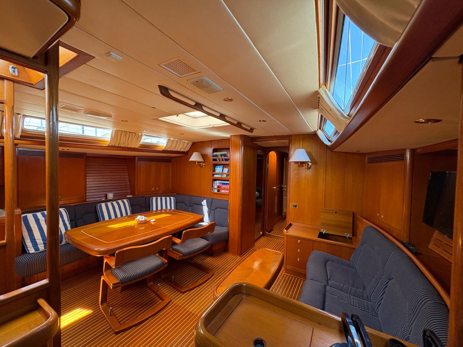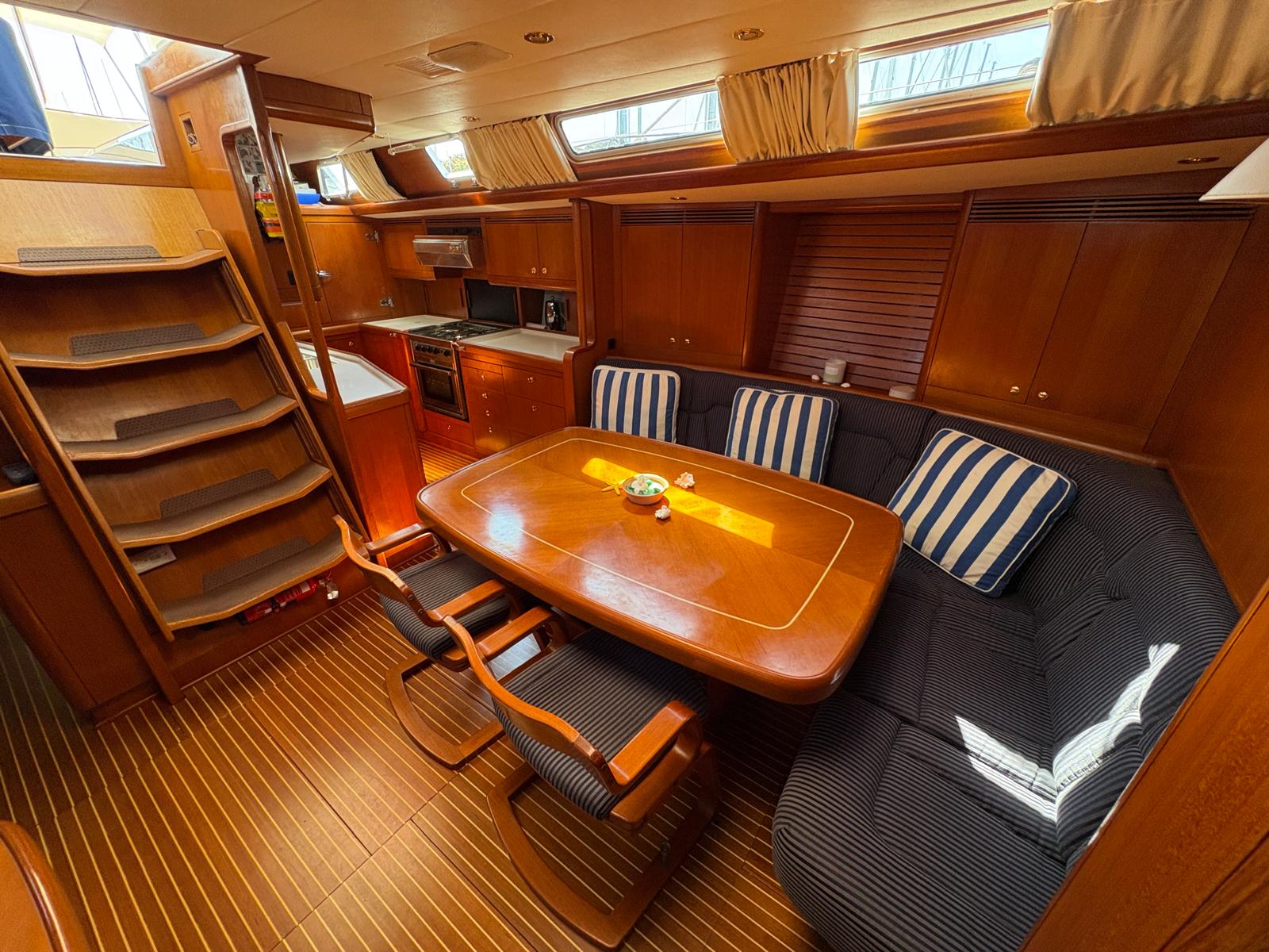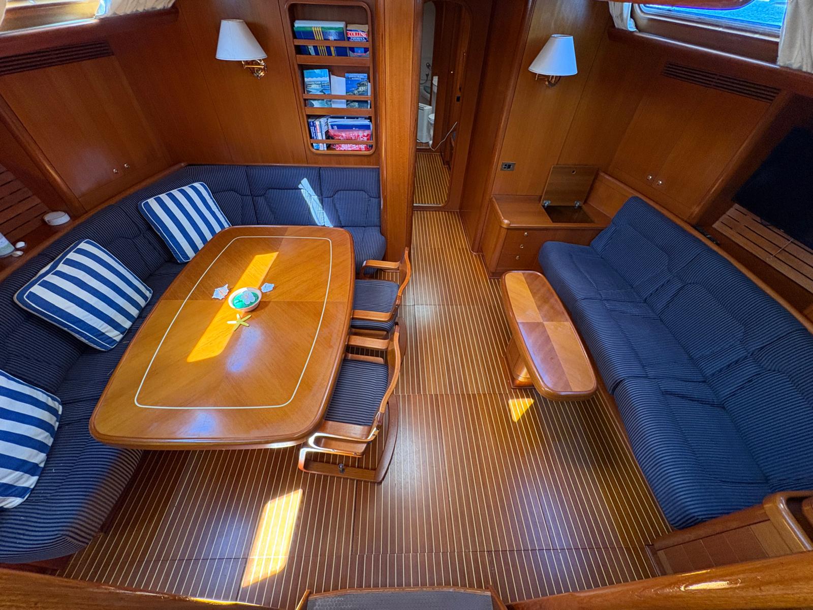 - Teak interior with a starboard bunk cabin, portside queen cabin with leeboards installed in 2023, aft master cabin with a large central bed & ensuite. Saloon: Midships with starboard living area and portside large table & galley. The double cabin had lee boards installed in 2023.