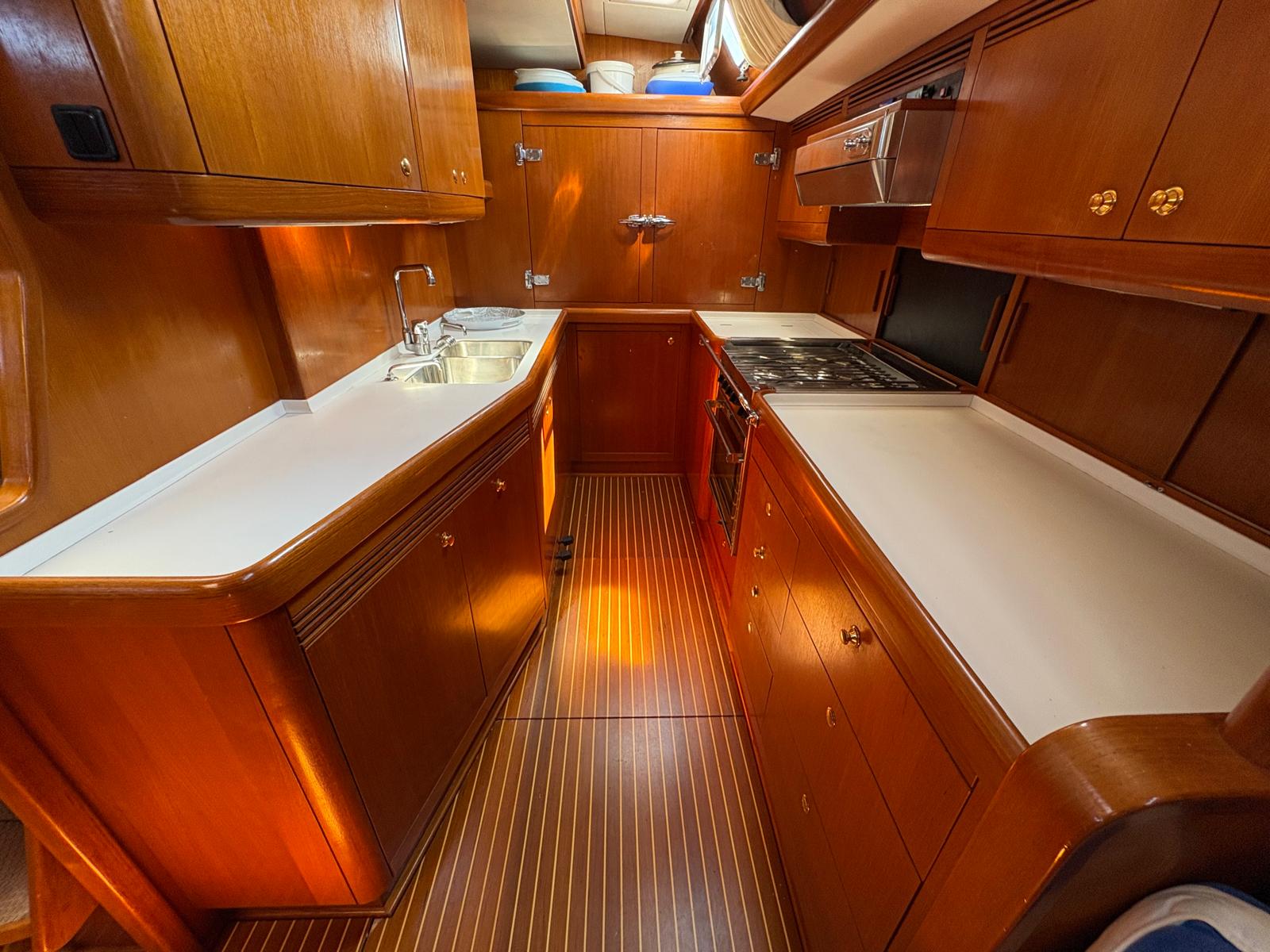 - Large portside U-shaped galley with microwave, large double refrigerator & freezer. 4-burner r-Butner stove & oven on gimbal.