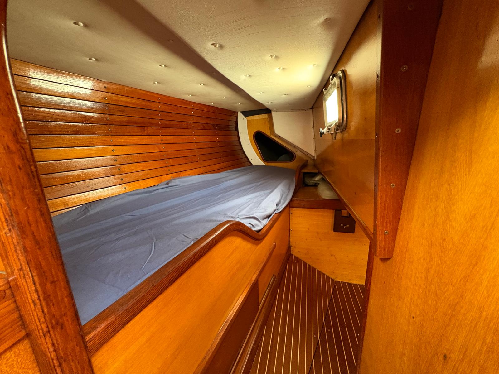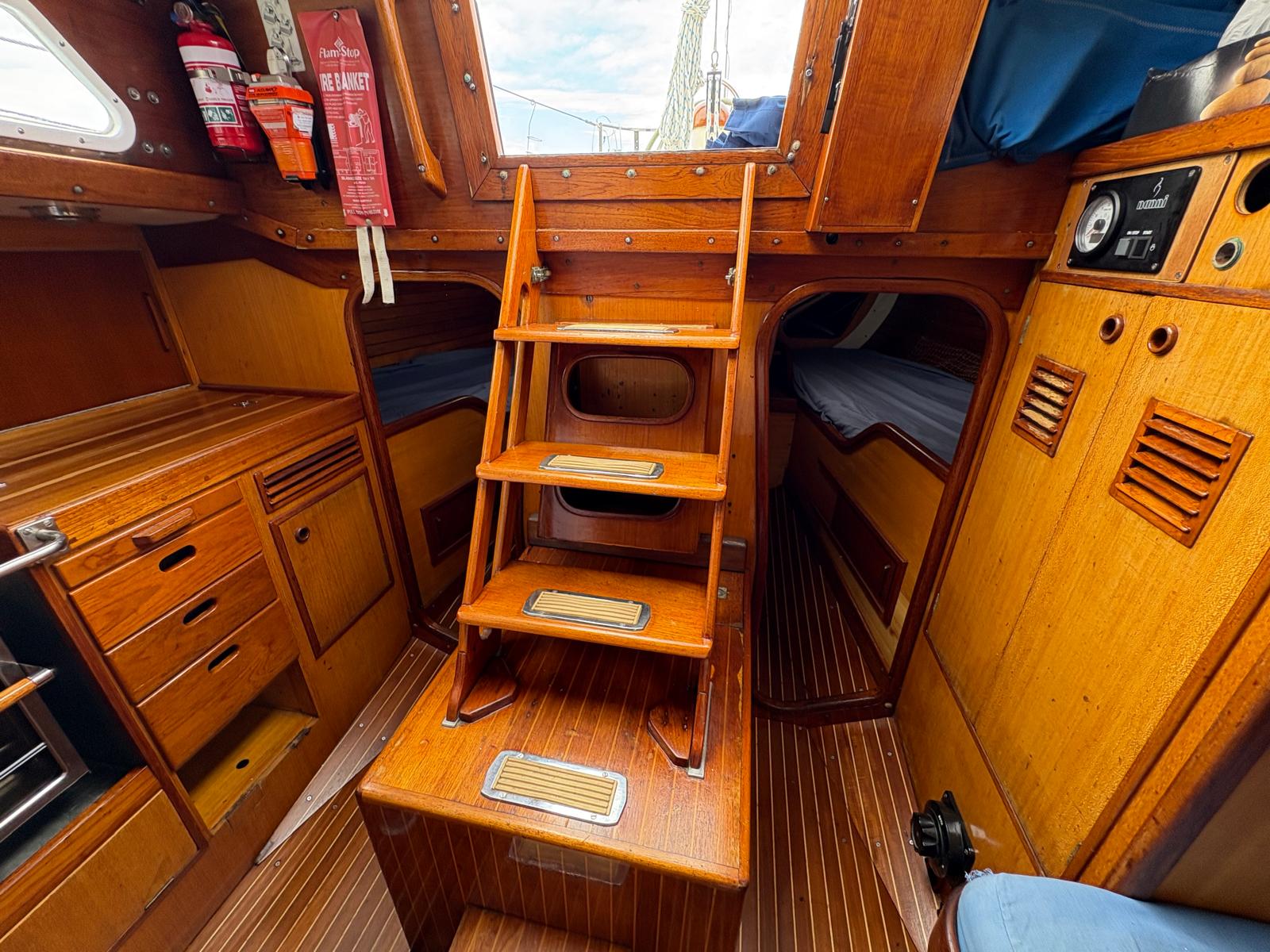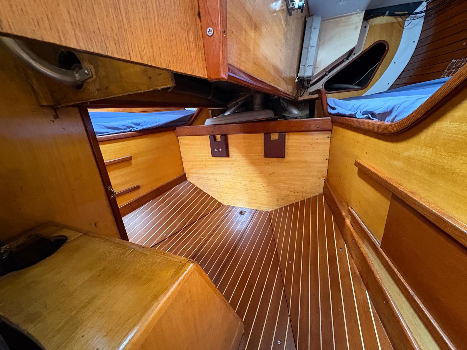 - Warm teak interior with opposing settees and a folding teak table. Excellent storage in lockers and shelves along both side, with good light and ventilation from opening ports and hatches. Timber finishes are all recently touched up.