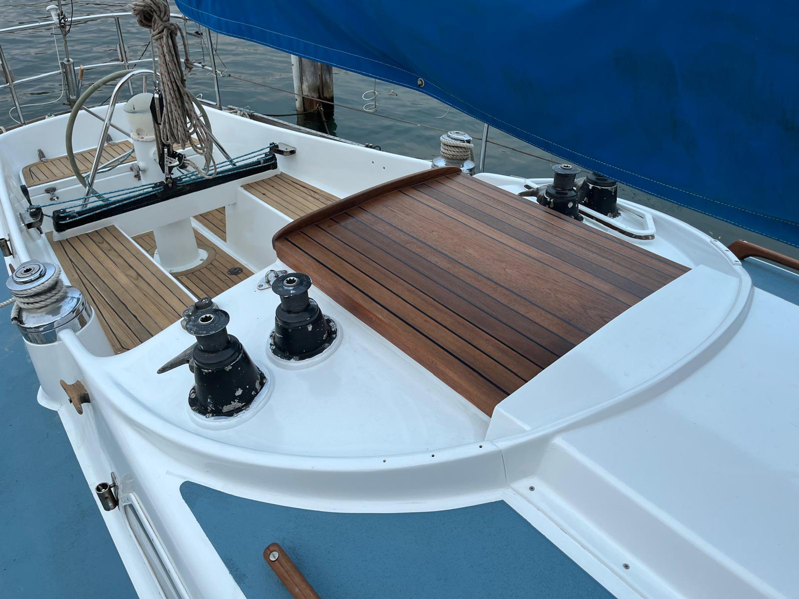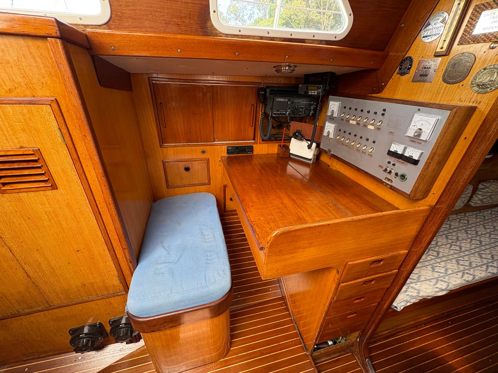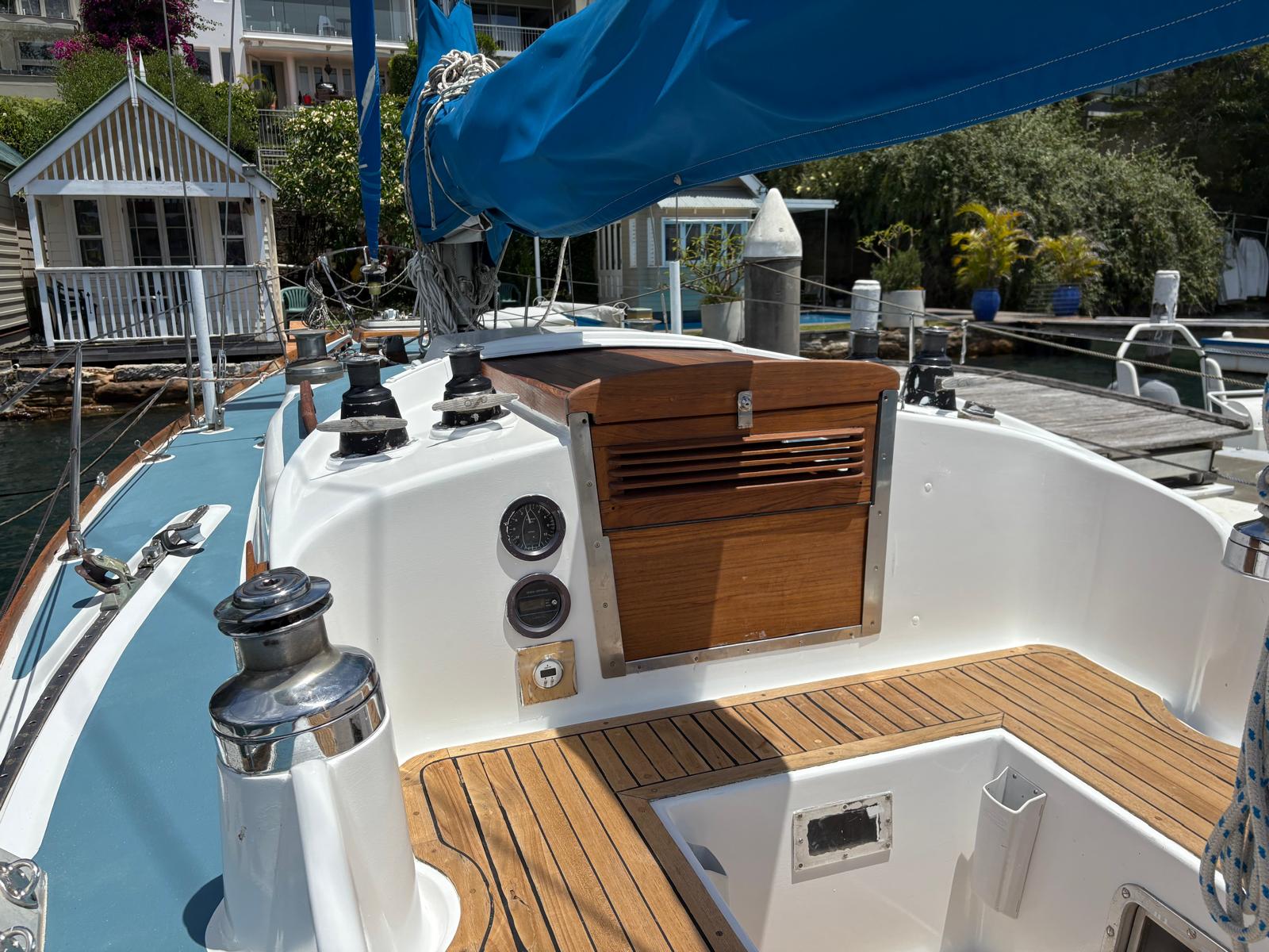 - Warm teak interior with opposing settees and a folding teak table. Excellent storage in lockers and shelves along both side, with good light and ventilation from opening ports and hatches. Timber finishes are all recently touched up.