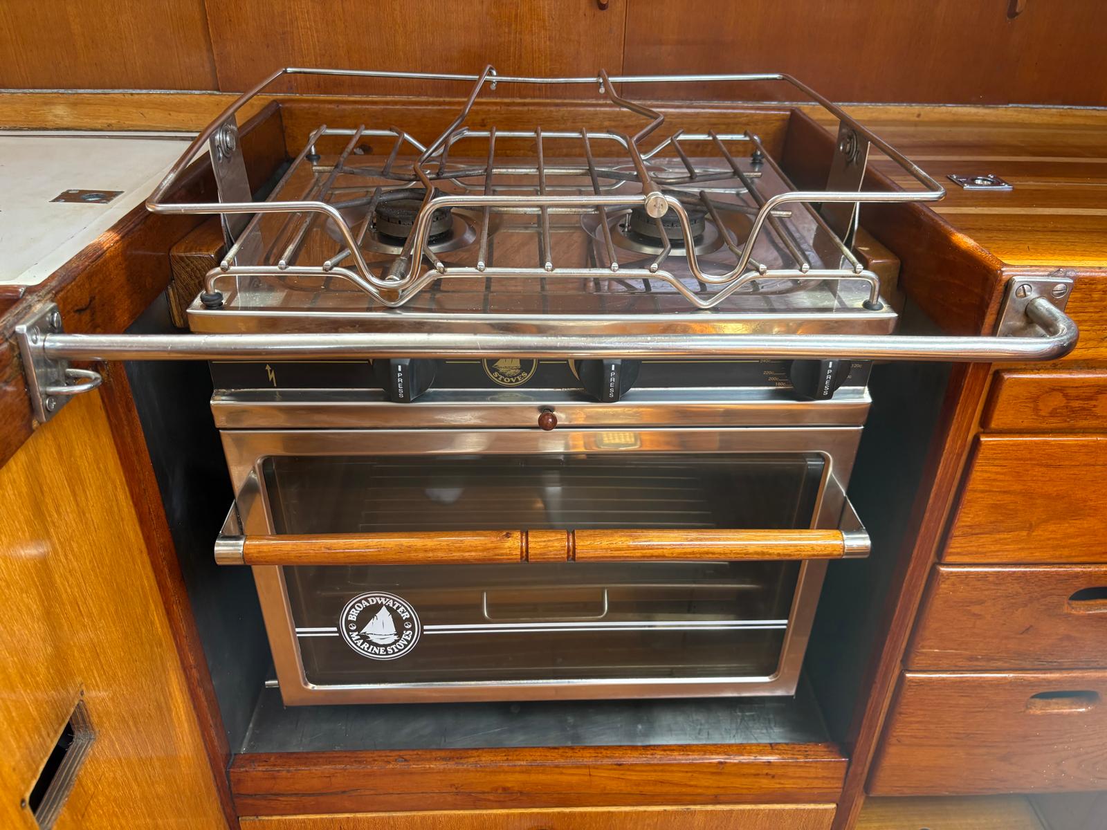 - Equipped with two burner Broadwater Marine gas stove and oven on gimball, Stainless steel sink with manual pump and saltwater tap, and a topload refrigeration unit. Galley has ample storge throughout.